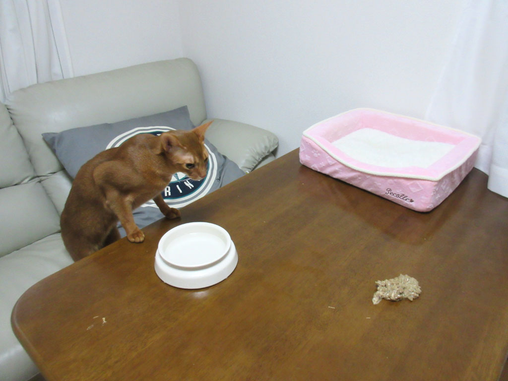 と言うのも、猫たちが朝ご飯を食べ終わって、アビのすけは1階に下りて来ていたのですが、その時、私はたまたま1階の猫トイレを掃除していて、アビのすけはソファーの背中の所にいたのですが、アビのすけを見たら、何やら、ゲボゲボとエアー吐きで餌付いていたのを発見して、私は、こんな所で吐かれたら掃除が大変だと、咄嗟にアビのすけをテーブルの上に連れて来たのです…、そしたら、すぐにテーブルの上で吐いて…。