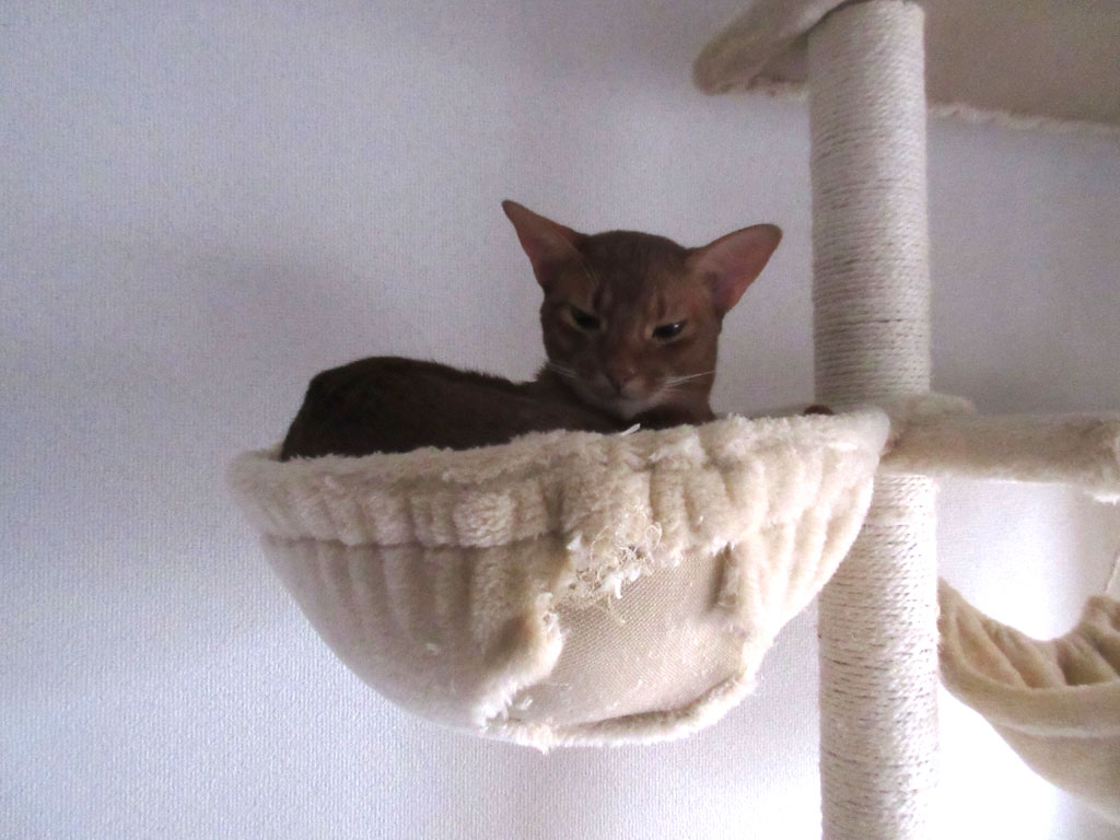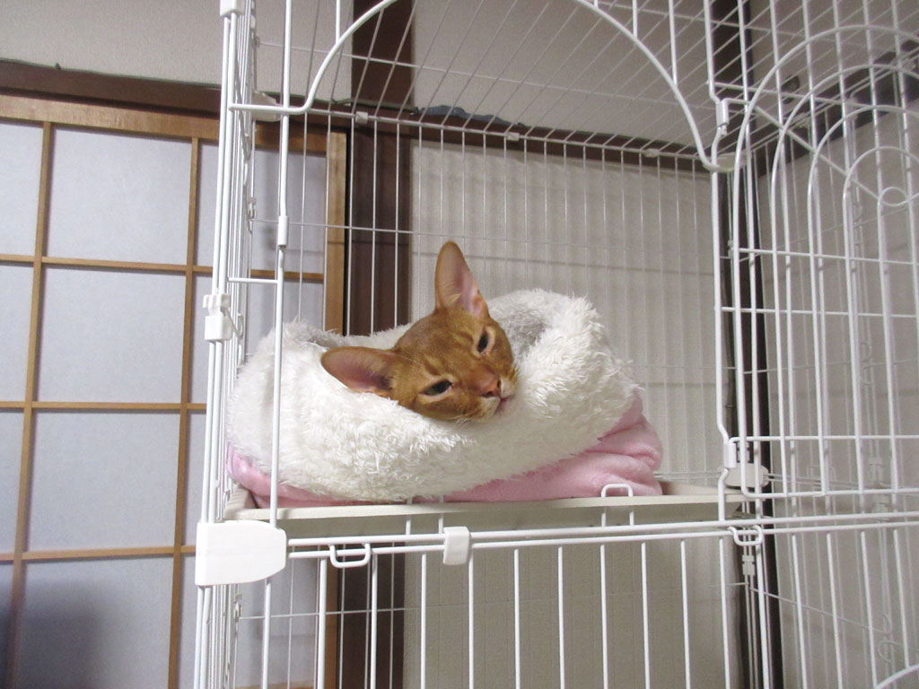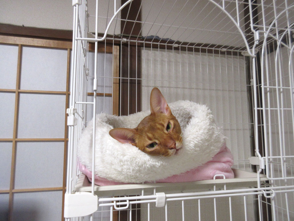 これは同じ日、おとといの晩遅くのアビのすけの様子ですが、2階のケージの3階部分の猫ベットで寝ていたアビのすけでしたが、このぼ〜っとした、のぼ〜っとした、ボケ〜っとしたアビのすけの表情…、酷い顔…。