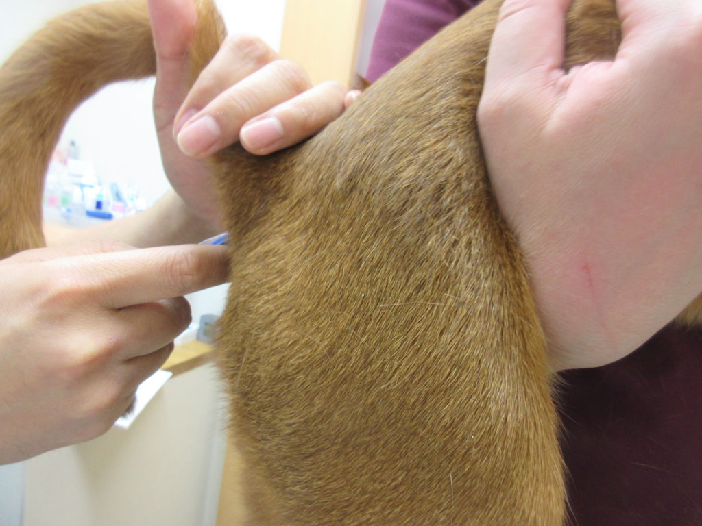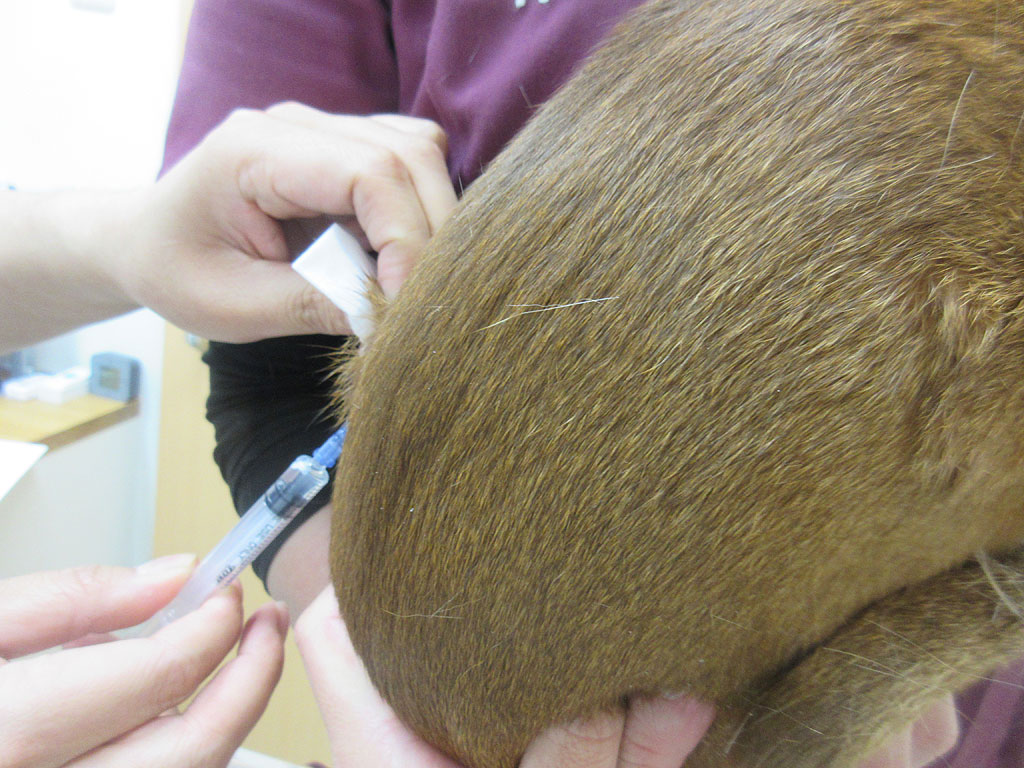 そして、アビのすけの背中? 後ろ足? に注射針が刺さったぁ〜…、あれ!? アビのすけ、鳴かなかった…。