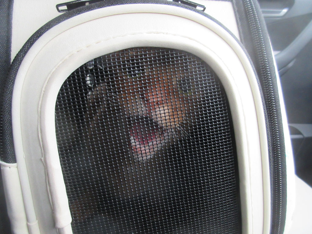 これ、往きしの車中でのアビのすけの様子ですが、とにかく、最初から最後まで、ずっと鳴きっ放しだったアビのすけ。
