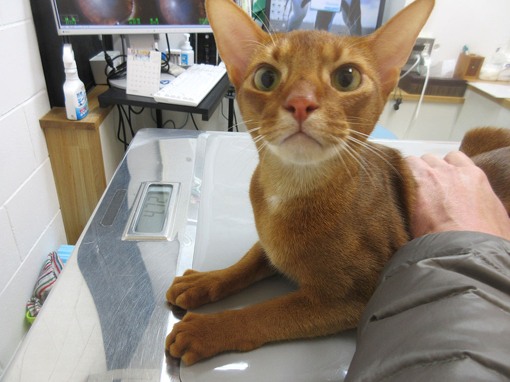 まずは、いつもの通り、体重測定から…、アビのすけはビビッているのか、ハッスルしているのか、とにかく動き続けてくれて、私がアビのすけを抑えて、やっと体重が確定。