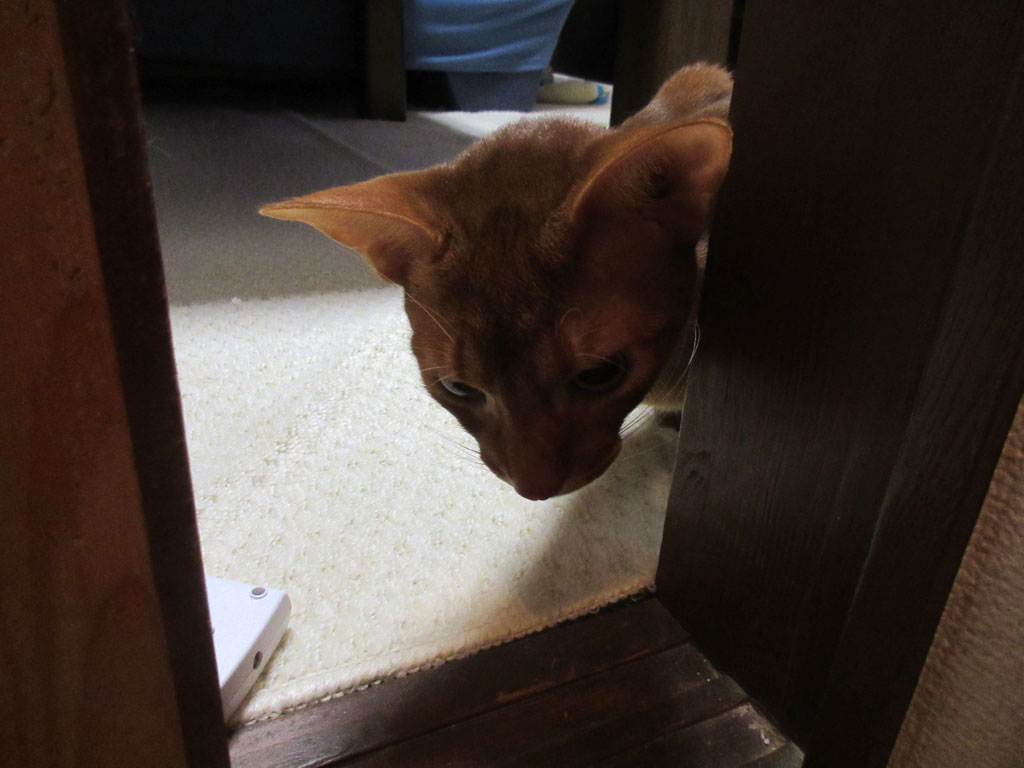 普段、こんなアングルで撮る事はないのですが、私が1階に行って戻って来たら、落ち着きのないアビのすけが、「ペットぐぐ〜る」の向こうで待ち伏せをしてくれていたのです。