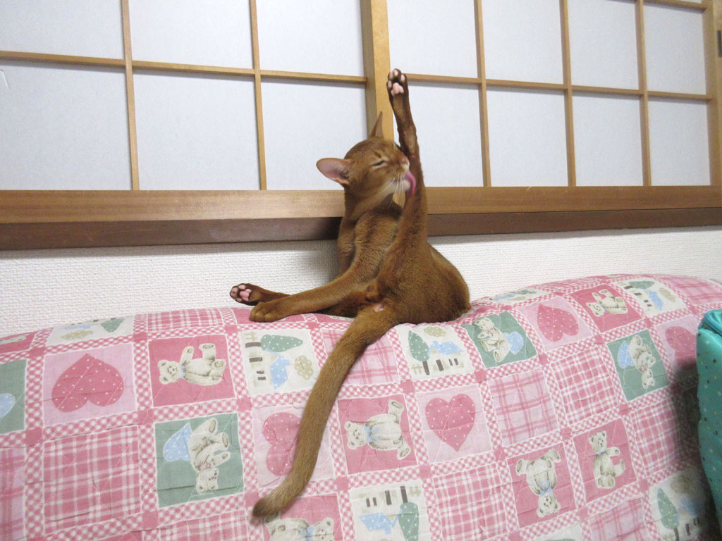 甘えん坊なアビのすけ。あ〜あ…、寝転んだままでお手々をペロペロして…、アビのすけは甘えん坊なんだよなぁ〜…。