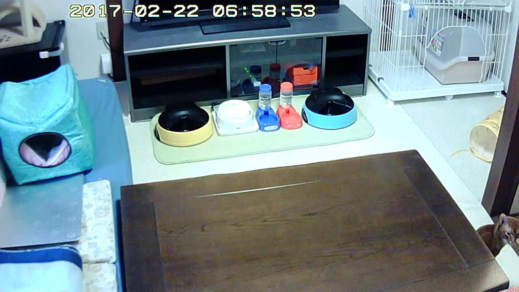 タイ時間の朝5時前(日本時間の朝7時前)、睡眠時間、1時間から2時間位のめっちゃ眠い中、猫たちの朝ご飯の様子をチェックしようと、ベットから飛び起きてWebカメラを覗いてみたら、アビのすけが既に、ご飯を待ち切れずに、部屋の中を徘徊していました…、