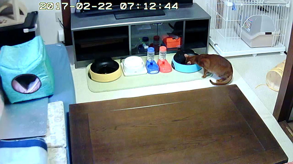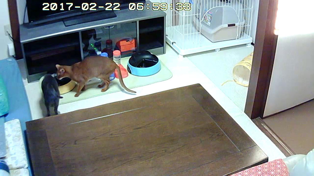 欲張りなアビのすけ。そして、日本時間の朝7時になる30秒前、自動給餌器が動き出した瞬間、猫たちが大集合。