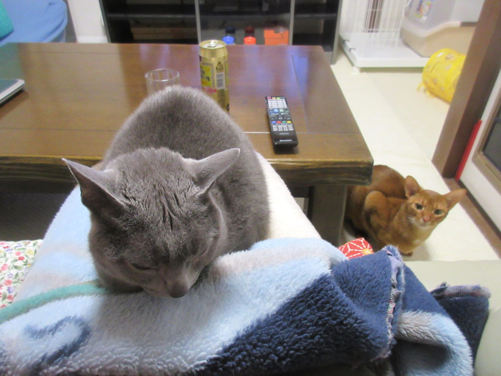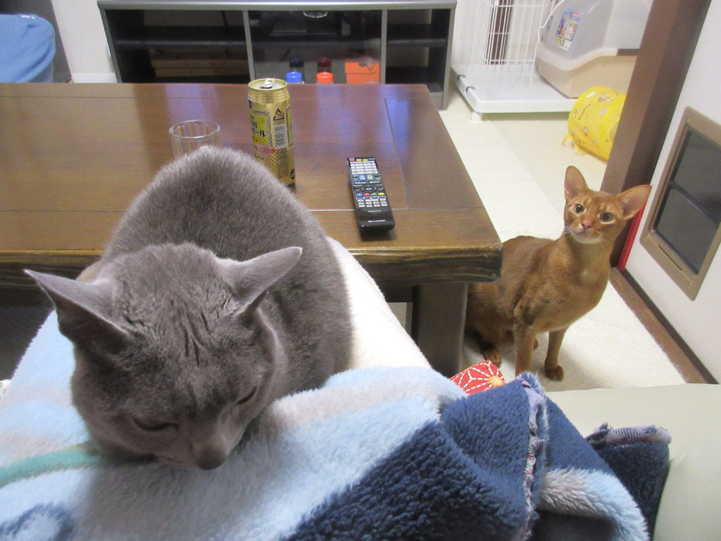 それから、私は簡単に旅行後の整理をし、お風呂に入ってスッキリして、この写真、さぁ、今から、ホッコリと焼酎でも飲んで、猫たちとまったりしようとしていた写真…、座机の下から、アビのすけがこっちをじぃ〜っと覗いているのが分かりますでしょうか…、もう、遊びたくて仕方がなかったアビのすけ君。(笑)