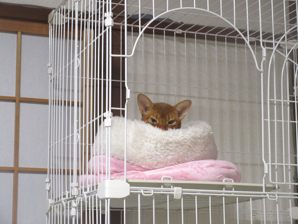 するとアビのすけ、ケージの3階の猫ベットに行って、ふて寝をするのかい…、寂しげなアビのすけも、何故か笑えてしまう私…。(笑)