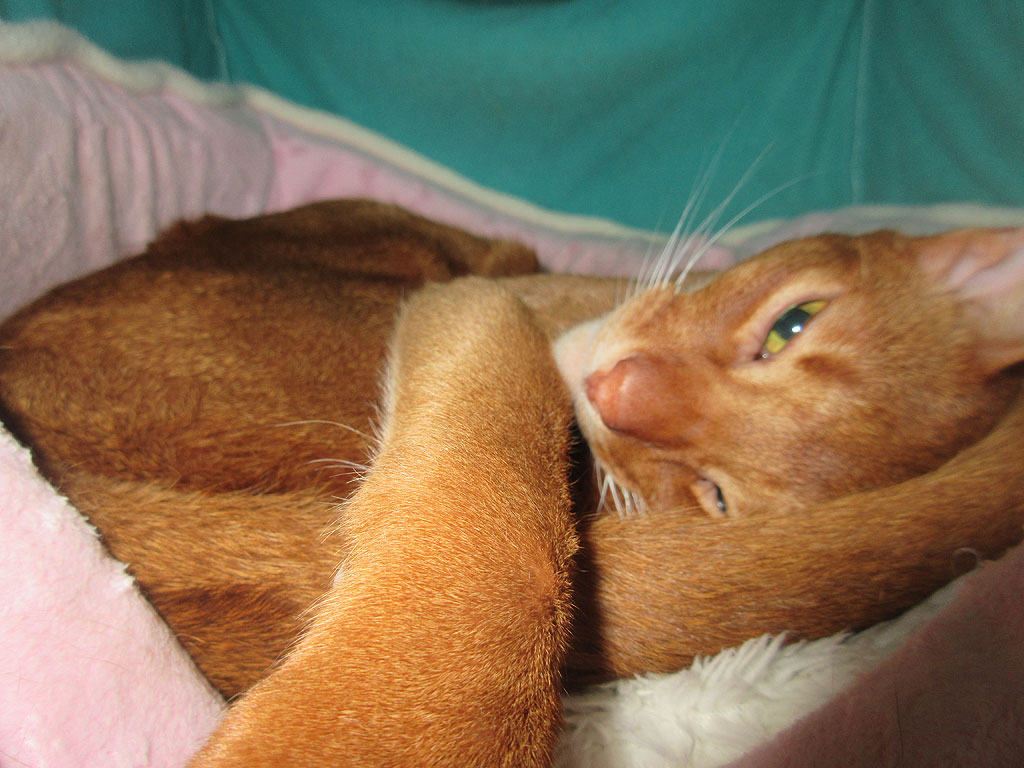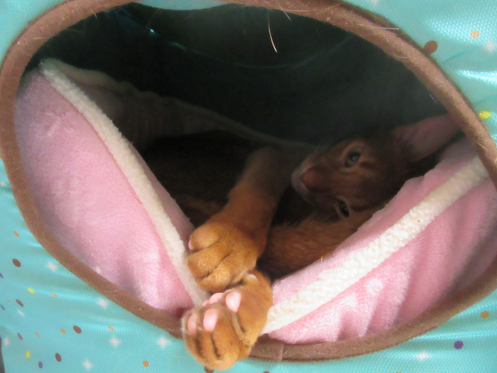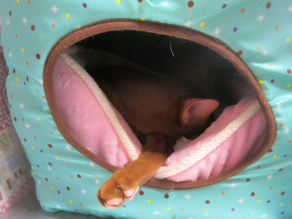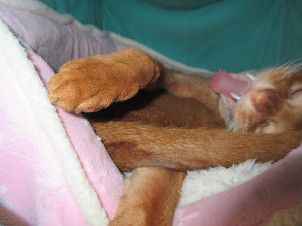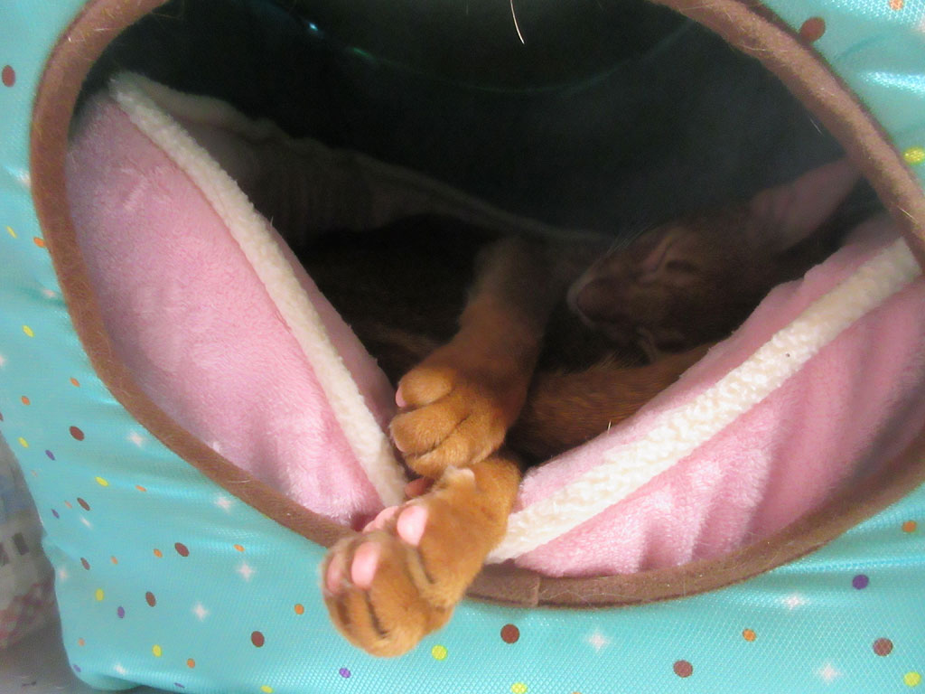 うちの男の子たちもよく片手だけ出して寝てます。女の子は、丸まりつつ、なぜか両手が伸びて万歳ポーズがときどきありまして…。なんだろう。そのときのお尻が真ん丸で妙に可愛かったりします。思わずお尻に頬擦りしてしまうくらい。やっぱり、女の子はお尻が丸みを帯びてるように感じます。布団にもぐりこんでくるときとか、尻尾をピンと立てて、お尻をふりふりしながら入ってくるんですけど、やせっぽちなのになんだかお尻のふっくら感がたまらなくいとおしいです。ひぃにはそんな情緒がないですね。でも、甘えん坊特攻隊長はいつも全力で突っ込んでくるので、アビシニアンのそんなところがまた可愛いですよね。