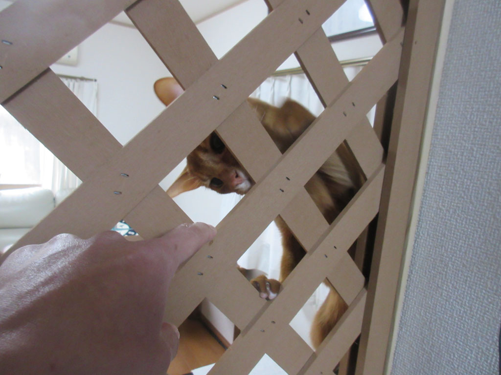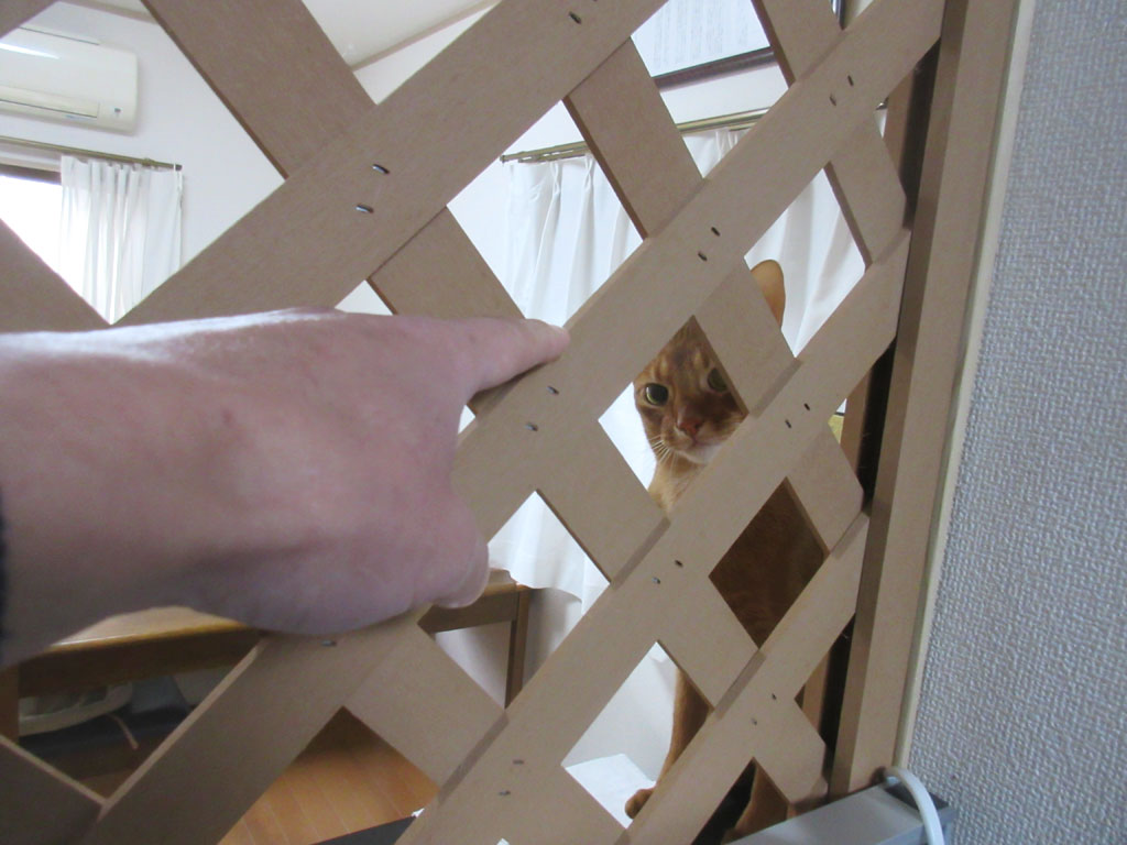 おバカなアビのすけ。このラティスの手前側が、私の仕事部屋なのですが、アビのすけはこのラティスの所にやって来て、早くご飯をくれって、とにかく鳴きまくり…。