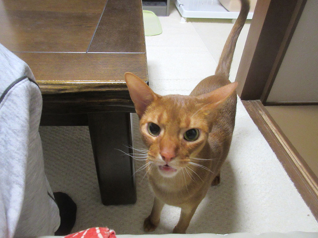 ご飯が欲しいアビのすけ。これは、今日の晩の8時半頃の事…、今から猫たちにご飯をあげる所で、既に、何事においても優先権のある、先住のロシ子にはご飯を出してあげていたのですが、今からアビのすけの順番で、尻尾をピ〜ンと立てて、ご飯が欲しくて堪らないアビのすけ君。