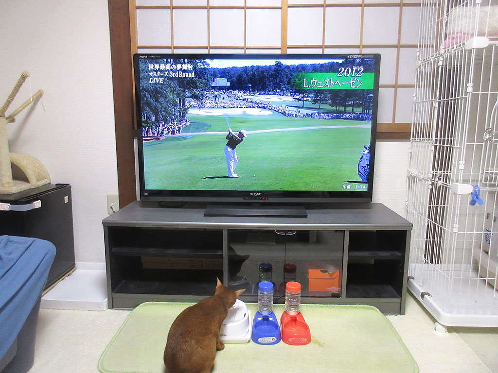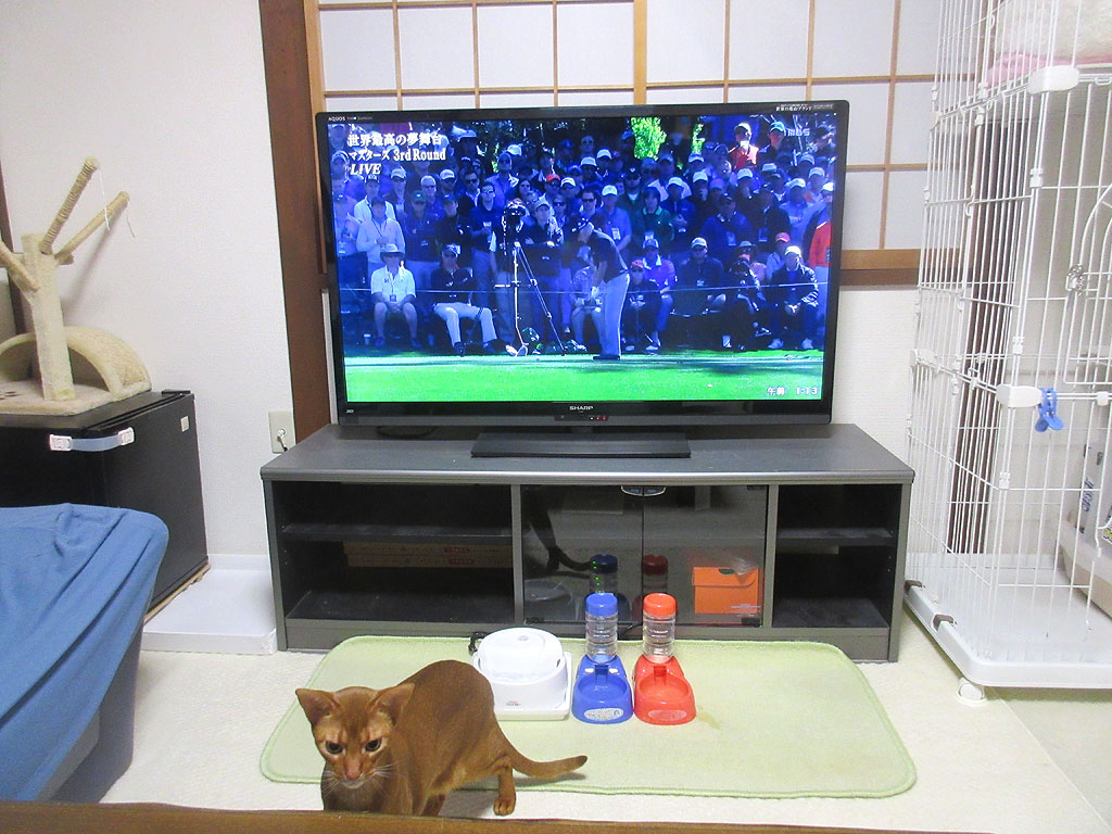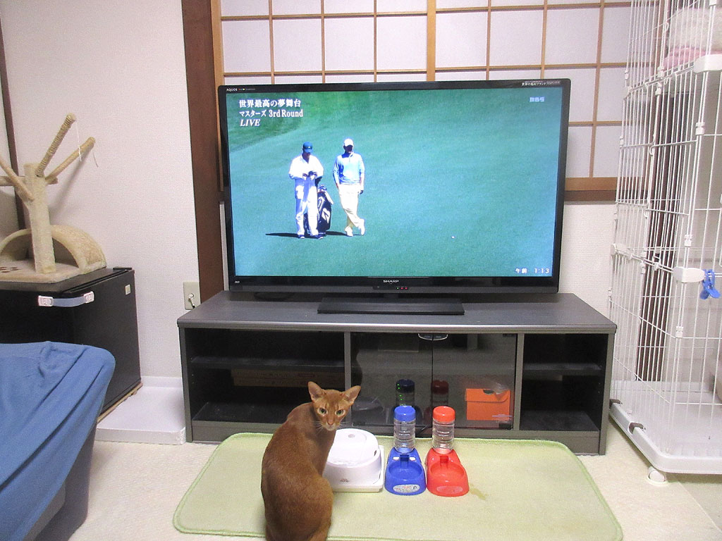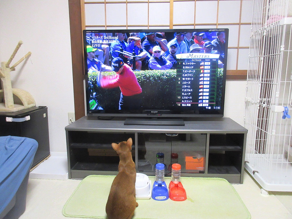 マスターズを見るアビのすけ。昨晩も私は、ゴルフの世界最高峰の夢舞台、マスターズを見ていたのですが、アビのすけも私に付き合ってくれて、一緒にゴルフを見ていたのです。