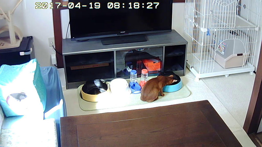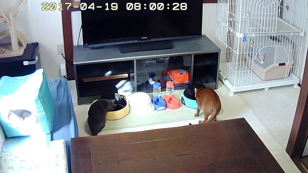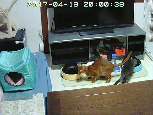 この様子を見て、アビのすけへの心配は吹っ飛びました…、これ、今日の猫たちの自動給餌器での晩ご飯の様子。