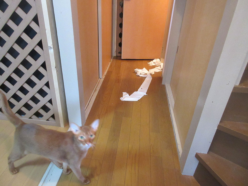 昨日の我が家の場合は、私のミスで戸を開けっ放しにしておりまして、たまたま、アビのすけがその時に1階に下りて来た様で、アビのすけが悪戯をしたのだと思いますが、仮に、ロシ子が1階に下りて来ていても、ロシ子も穏やかな割には、好奇心が旺盛ですので、悪戯をしていたと思います。
