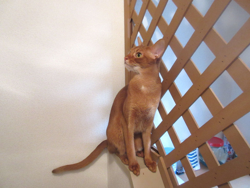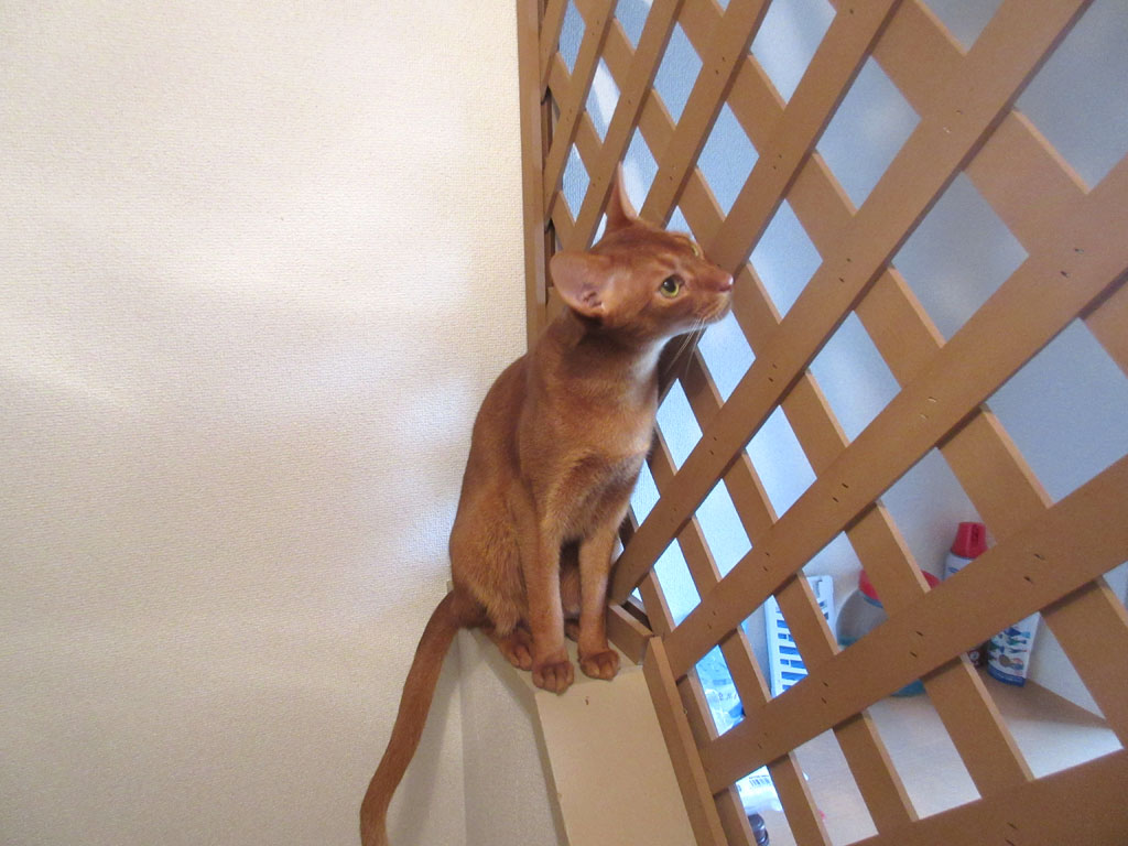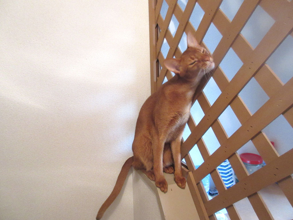 ラティスにスリスリ。ラティスにスリスリするアビのすけ君…、ロシ子ちゃんはロシアンブルーなので、ちょっと神経質な所もあるのですが、アビのすけはアビシニアンなので、神経質など皆無…、鈍感と言うか、無神経と言うか、初めはムカついたけど、今では、そんなアビのすけが笑えて、とってもかわいいのです。