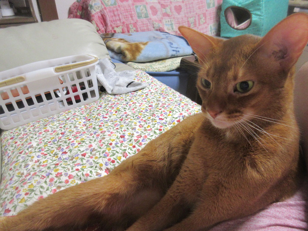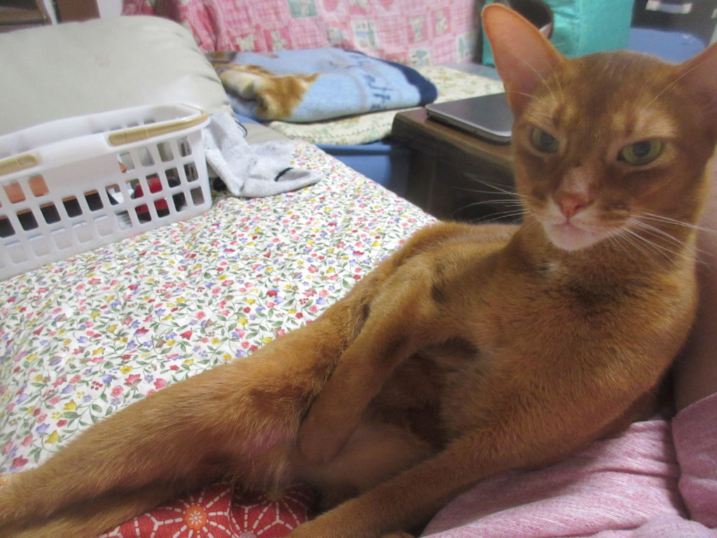 これ、昨日の晩遅くの事ですが、いつもの通り、人恋しいアビのすけ君が、私の傍にやって来て、こんな格好をして、まさに、右足の太ももの内側に出来ている皮膚炎を、舐める気、満々の顔をしていて…。
