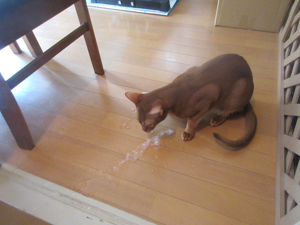 困ったアビのすけ。缶詰とかカリカリ系のゲボではなく、ほぼ、水みたいな、液体状のゲボ…。
