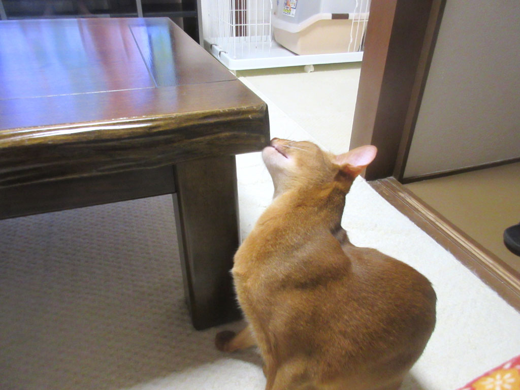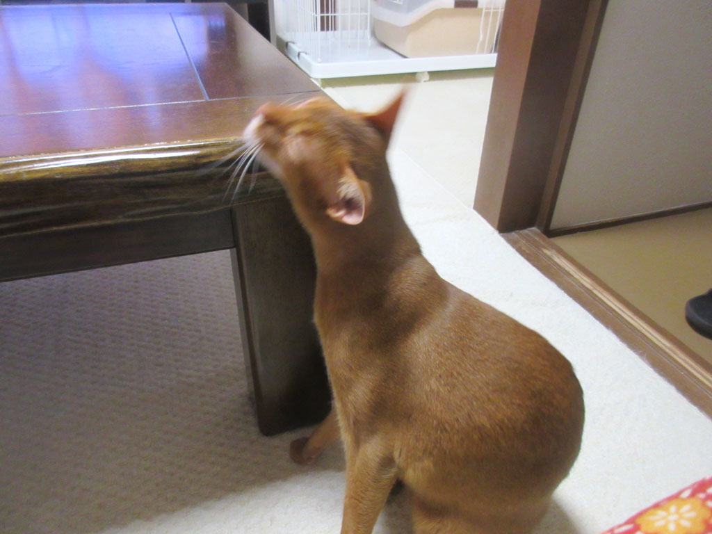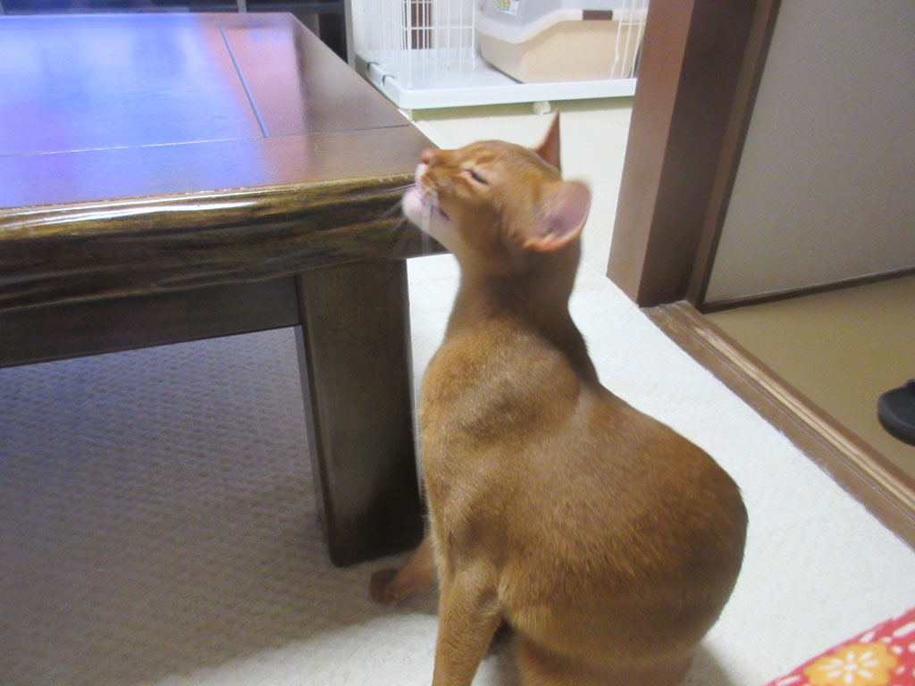 机の角っこでスリスリ…、間抜け面のアビのすけ君。 コメントを残す これ、昨晩のアビのすけ君…、アビのすけ、折角、私に近寄って来てくれたのですが、私は無視してテレビを見ていると…。 机の角っこに口元を持って行ったと思ったら…。 頬の辺りを机の角っこにすりすり…、あまりにも気持ちが良かったのか、お口が開いてしまって、また、間抜け面のアビのすけになってしまった…。(笑) 引き続き、悶絶の表情を浮かべながら、アビのすけはすりすり…。 一所懸命、すりすりをしていたアビのすけ君でした…、たまにアビのすけ、この角っこですりすりしているのです…、おバカでしょ…。(笑)