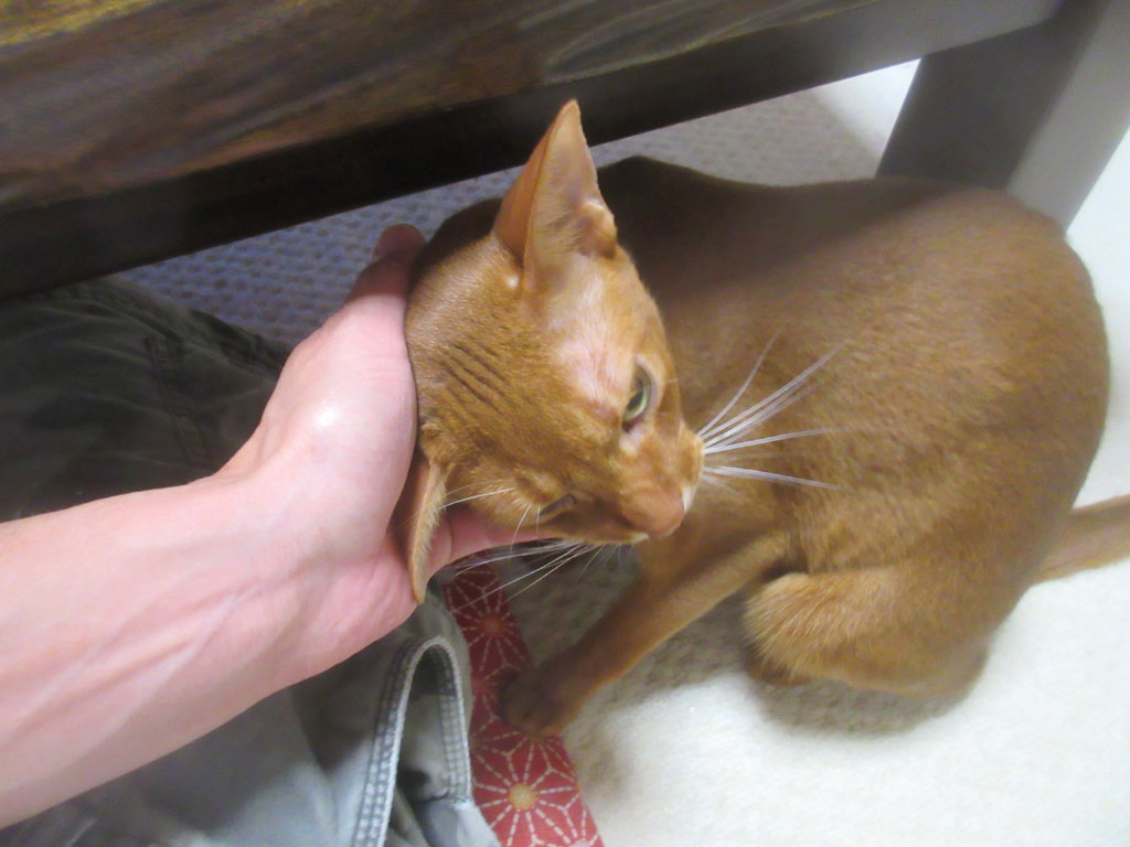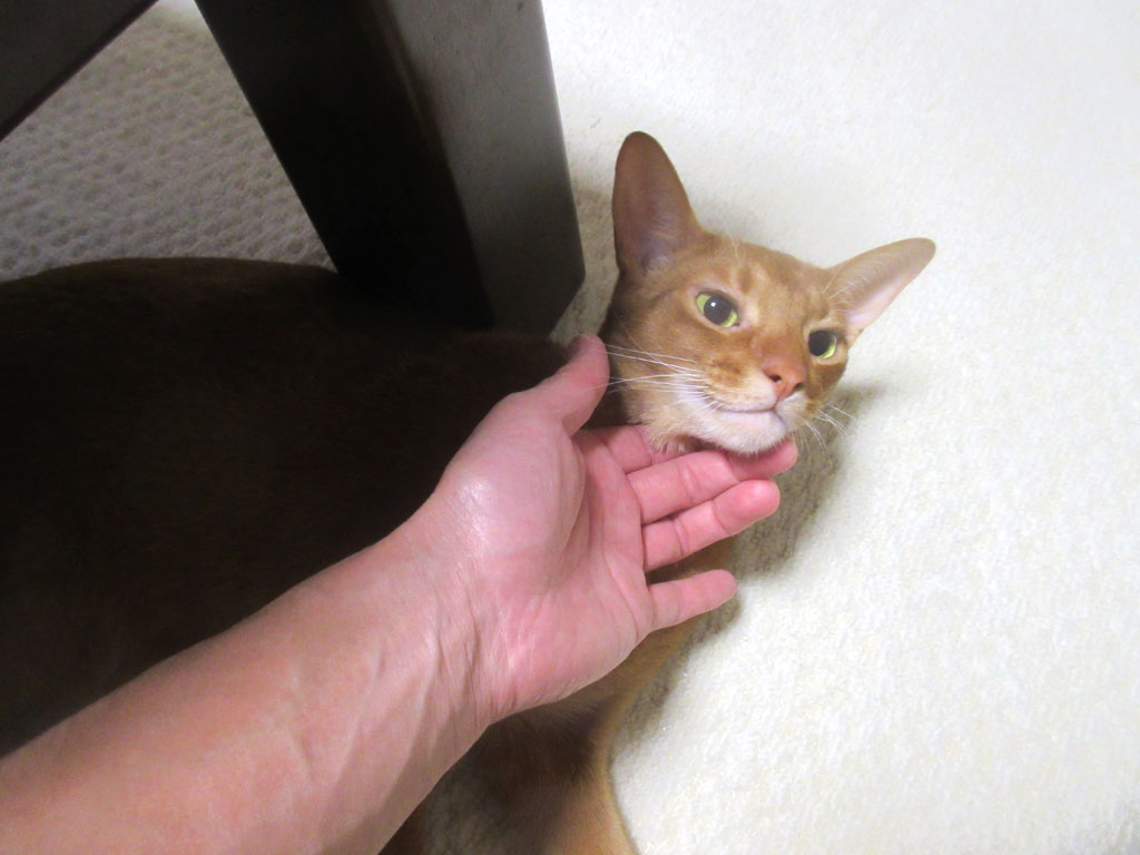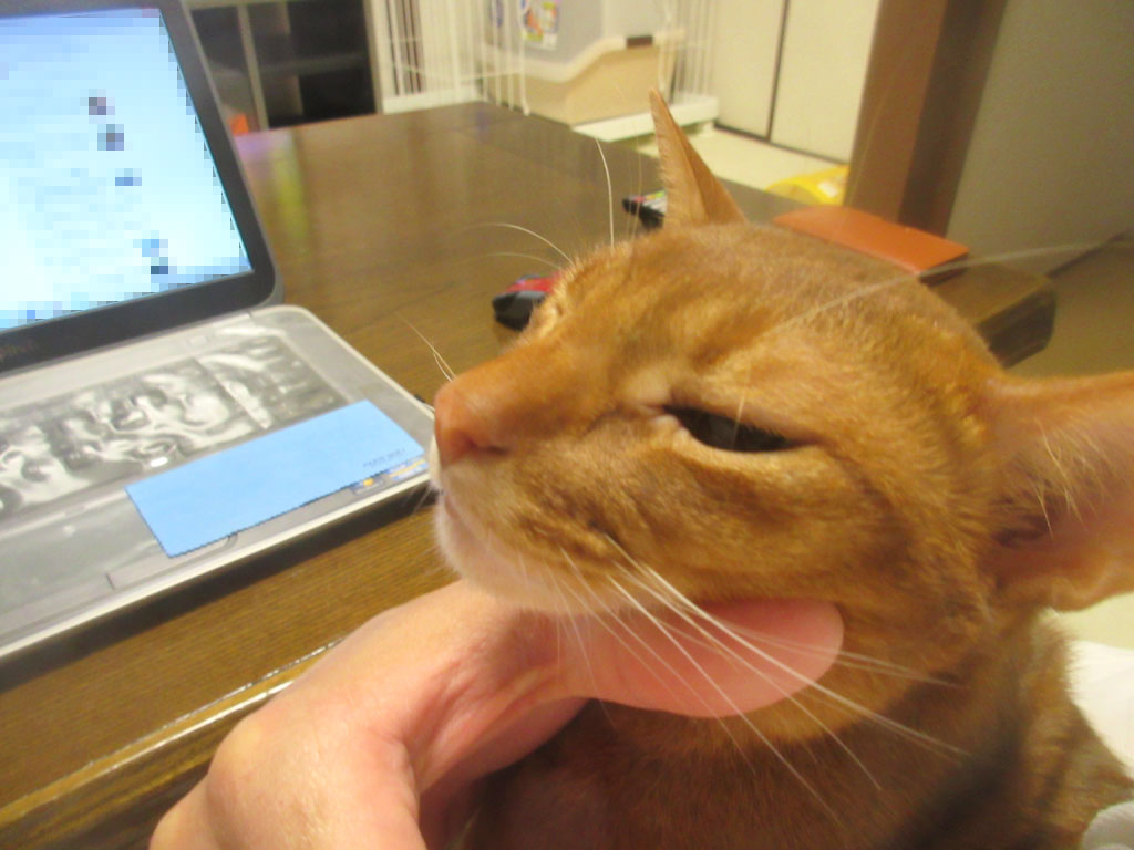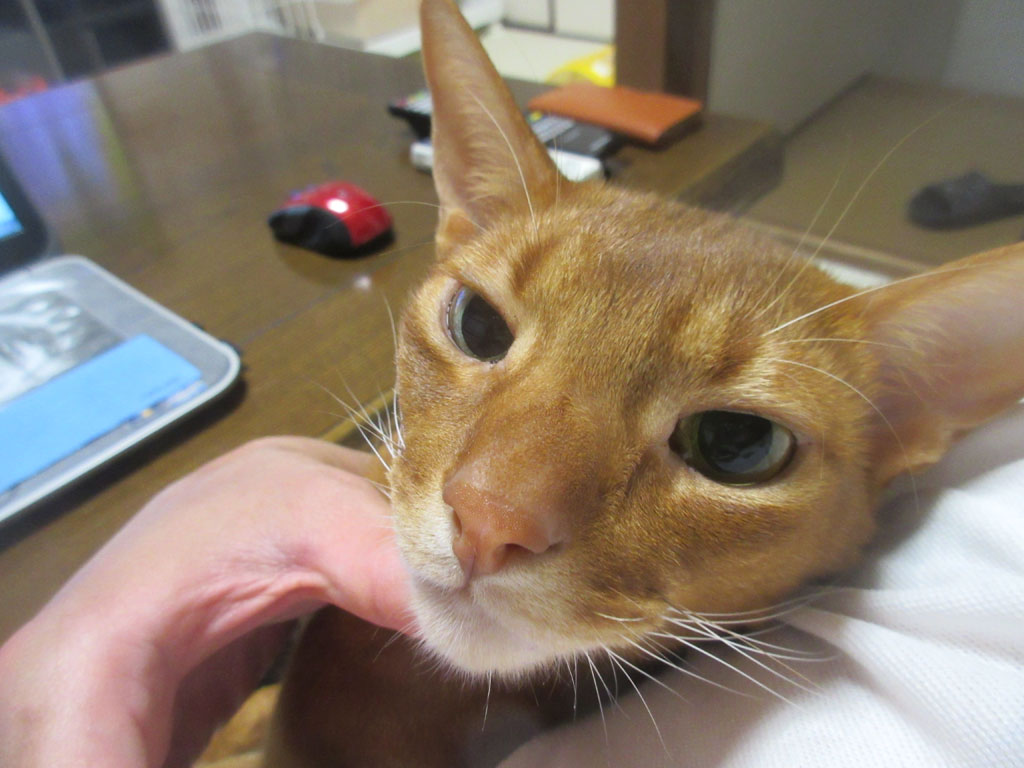 笑わせてくれる甘えん坊…、アビシニアンのアビのすけ君。 コメントを残す これは、昨日の晩のアビのすけ君…、昨晩も、遅い時間になると、アビのすけが私の下にやって来て、甘えん坊モードたっぷりのアビのすけ君…、おとぼけ顔が、とっても笑えるでしょ…!(笑) 私にすり寄って来ては、ゴーゴーと喉を鳴らして、鼻水をたっぷり、私の手に付けてくれるのです。 アビのすけを押さえ込んで、アビのすけの喉をスリスリ。 甘えたい盛りのアビのすけ君。(笑) 我が家のロシ子ちゃんも、女の子にしたら、とっても甘えん坊なのですが、アビのすけの甘え方は、べったりの甘え方…、これが、男の子と女の子の甘え方の違いなんだろうなぁ~…。