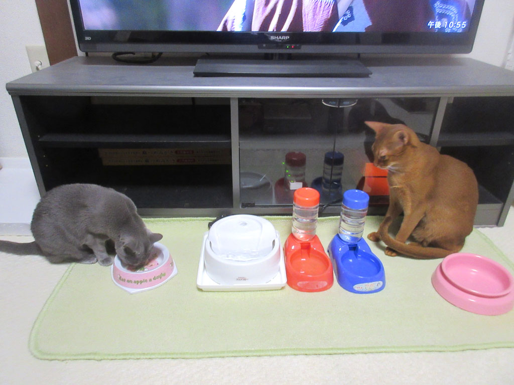 そして最後、これは、昨晩の我が家の猫たちのシーンですが、晩8時半頃に、猫たちに晩ご飯を出してあげて、アビのすけはすっかり完食…、ロシ子ちゃんは1回では完食してくれなかったので、ロシ子のご飯のお皿は、いつもの通り、そのまま放置していたのですが…。