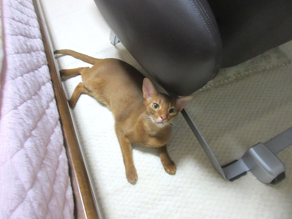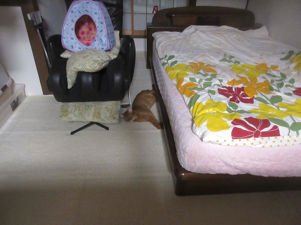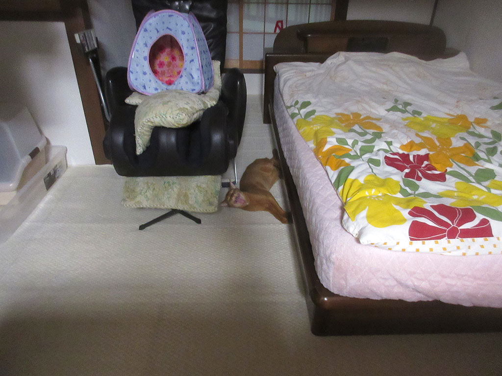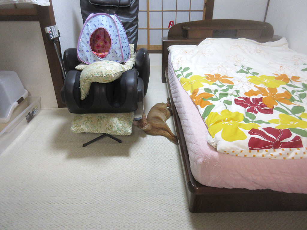 狭い所に、マッサージチェアーを置いているのも悪いのですが、アビのすけが地べたにベタっと寝られると、尻尾を踏んでしまいそうで、怖いのです。