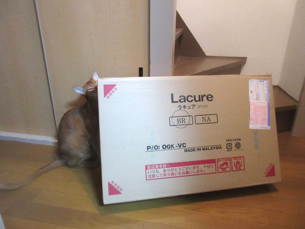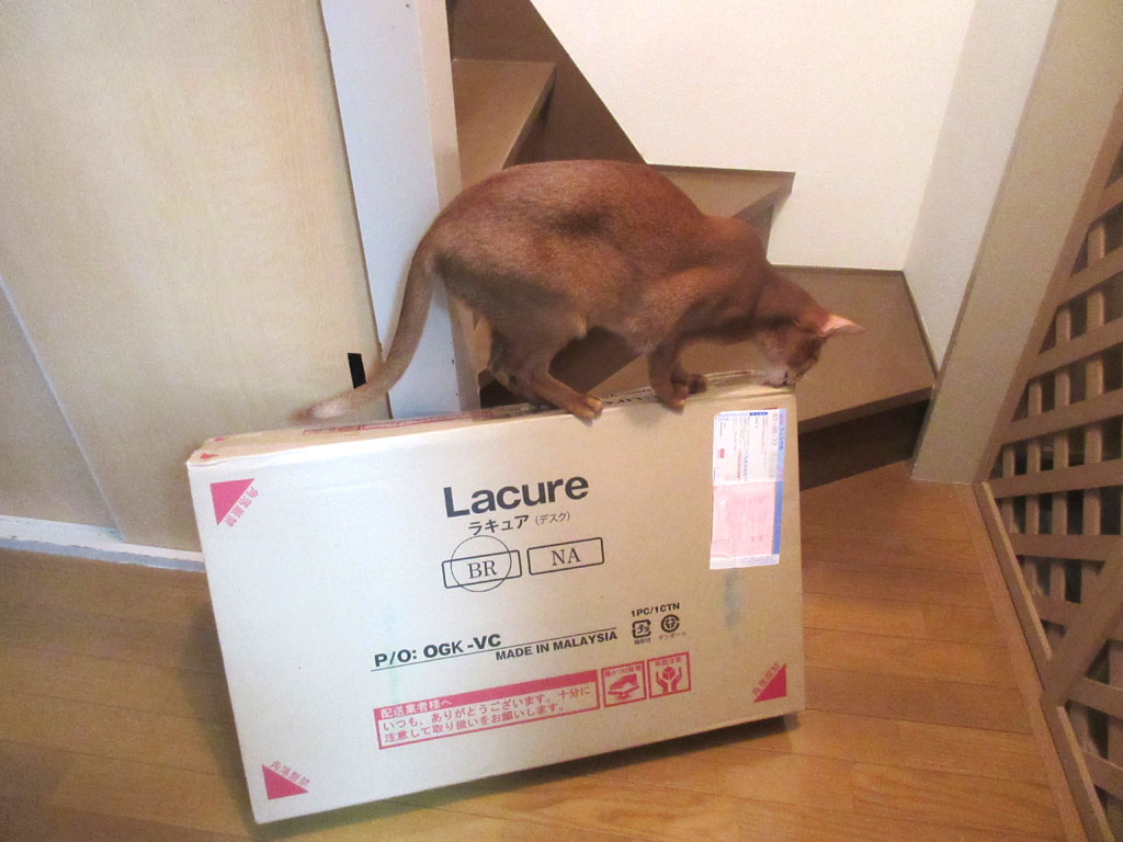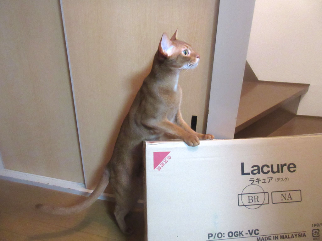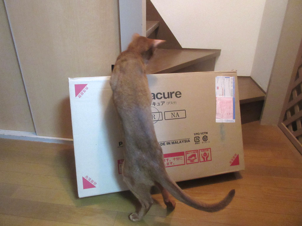 これは、昨日の晩8時過ぎの事でしたが、ネットで発注したパソコンデスクが届き、この日は晩遅くだったので開封しなかったのですが、箱をここに置いておいたら、早速、アビのすけ君がやって来て。