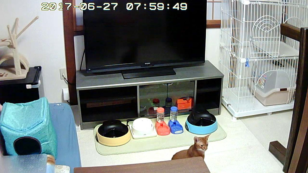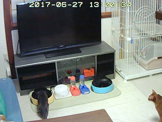 そして、3分後、アビのすけもフライングして、ご飯の場所にやって来た…、この後、自動給餌器が動き始め、猫たち、無事、朝ご飯にあり付けました。