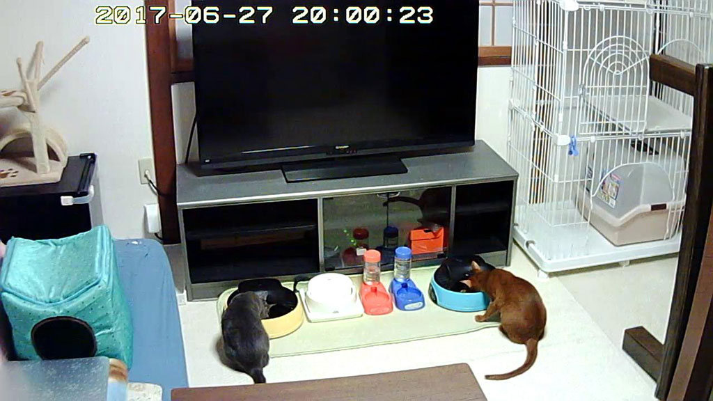 そして、ほんのちょっとだけ、心配をしていた、猫たちの晩ご飯…、ペットシッターさんセッティング後の自動給餌器が、無事、動いてくれました。