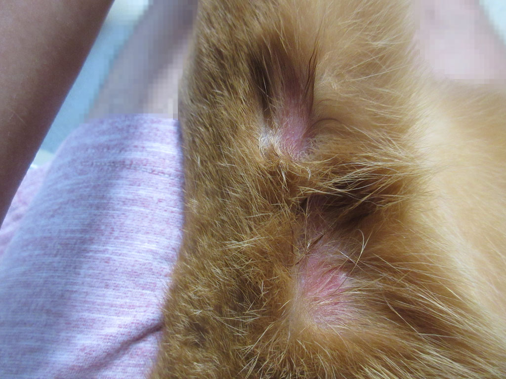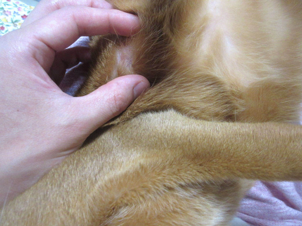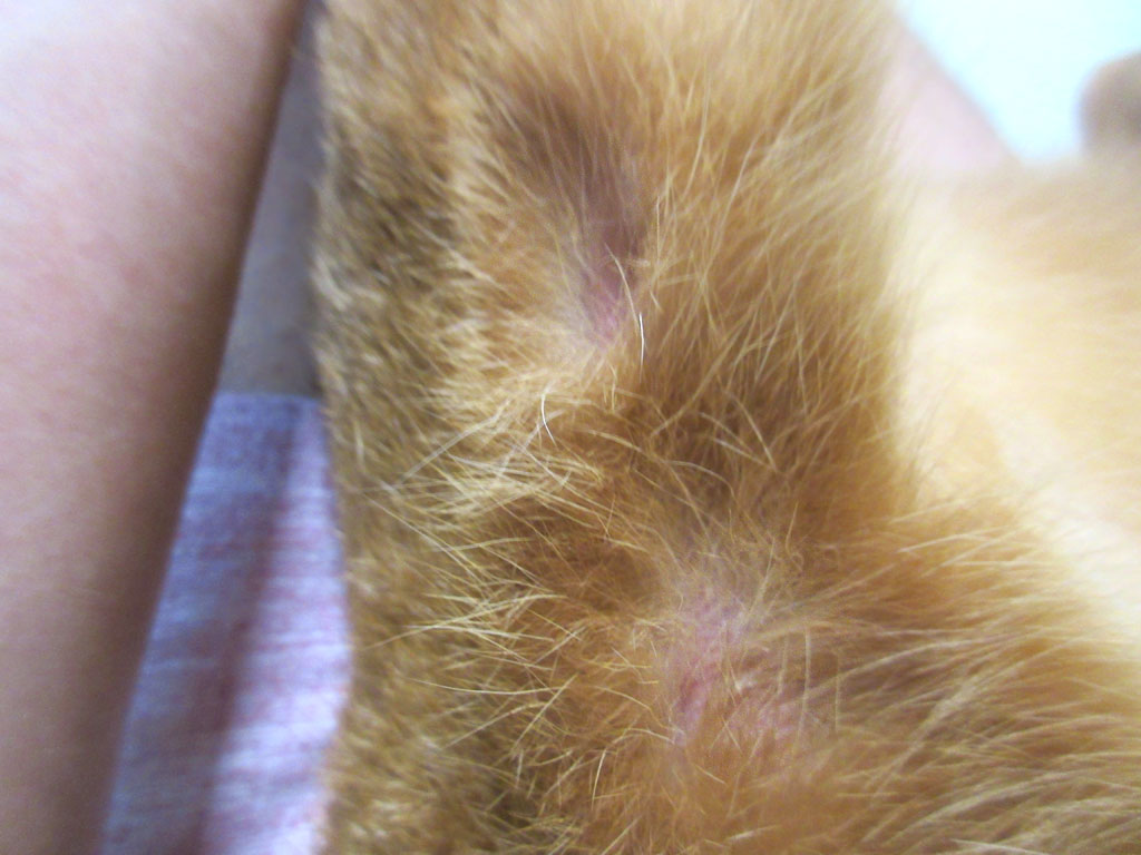 そして、モメタオティック後のアビのすけの皮膚炎の患部…、しっかりと毛が掻き分けられてるので、皮膚炎の部分がしっかり見えますが、酷いなぁ~…。(涙)