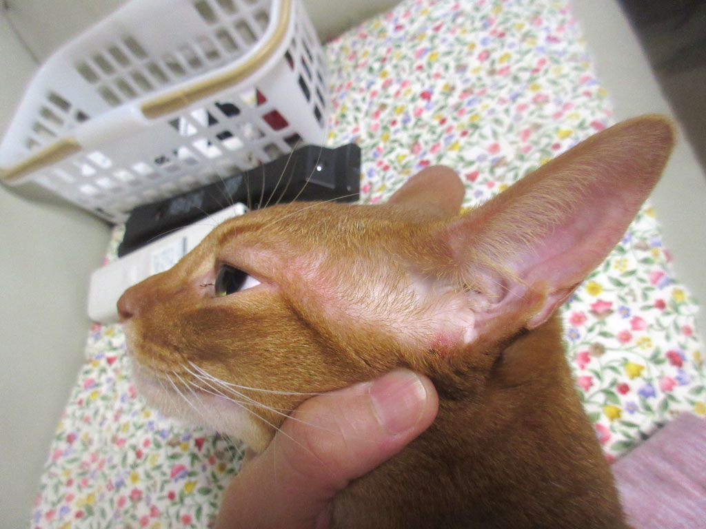 そしてこれは、さっきのアビのすけ…、耳の所にあったかさぶたをチェックしたら、ちょっと赤みを帯びているものの、きれいになくなってました。
