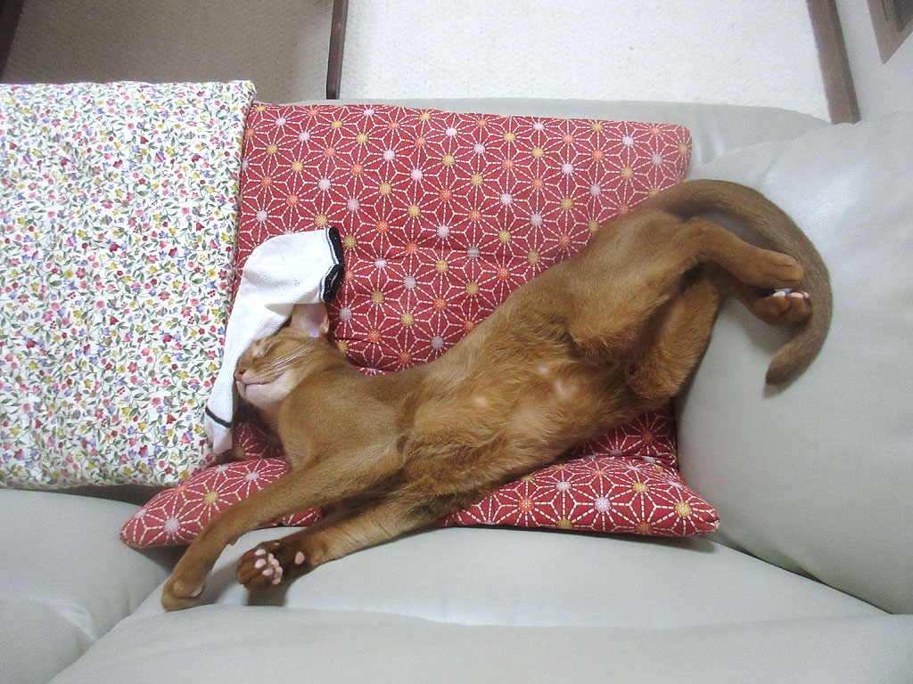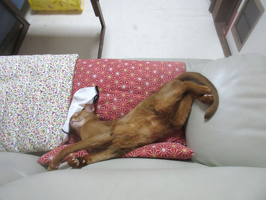 もう、いかにも男の子って感じの寝方で、私は朝一番から、アビのすけ君に笑わせて貰ったのです。