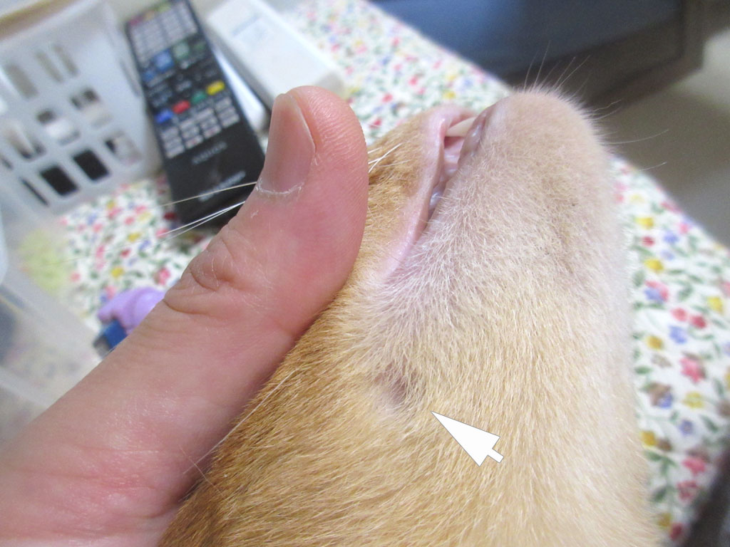 この矢印の部分、毛が抜けてたからか、穴が開いた様な感じになってて…。