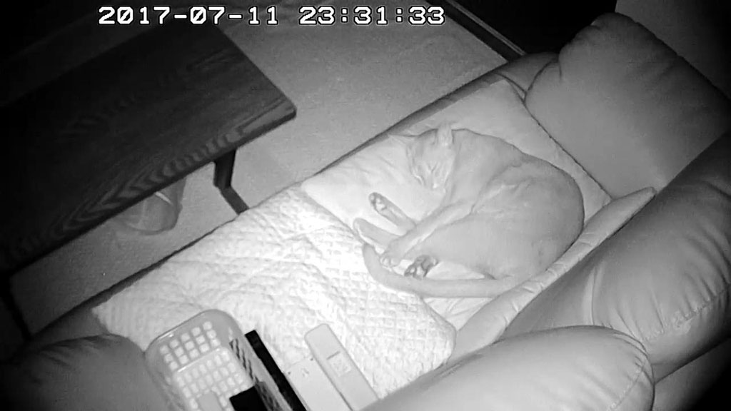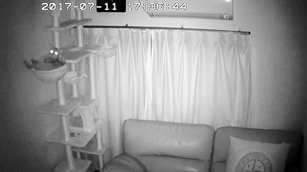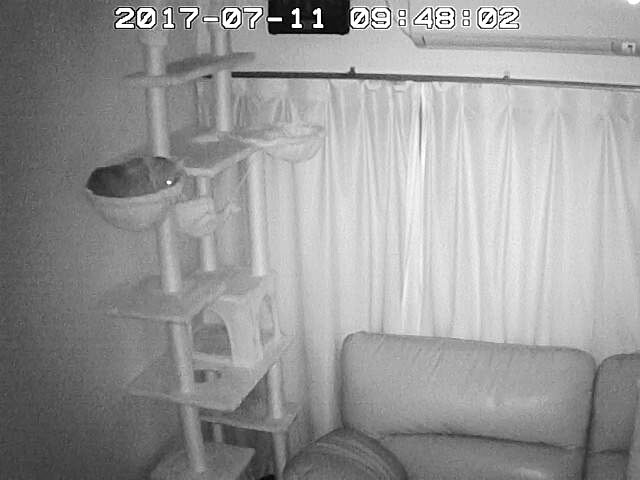 そして、私は外出先だったので、一旦、スマホのWebカメラを切って、また20分後に覗いたのですが、やはり、ご飯の場所には誰もいない…、猫たちを探したら…。