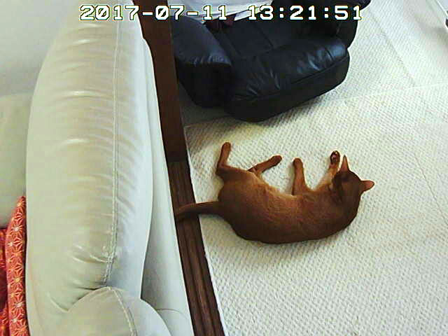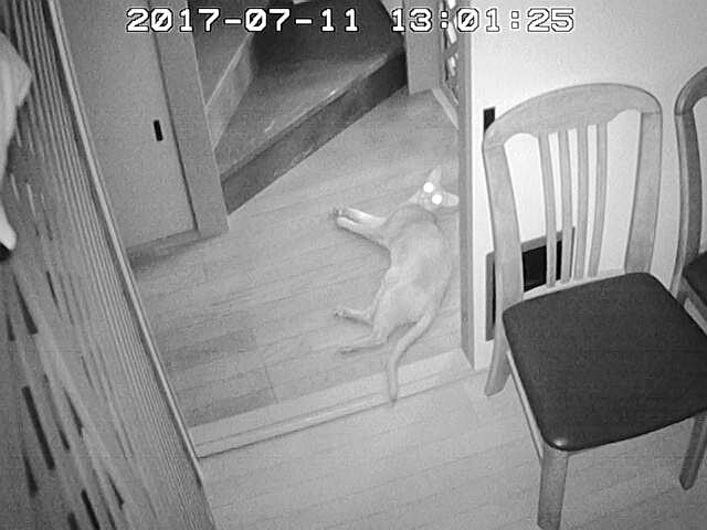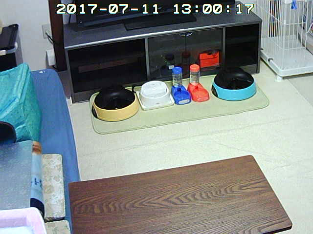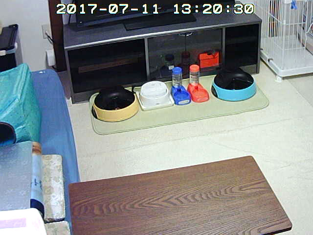 そして、私、Webカメラをご飯の場所に向けて、猫たちが来るのを待っていたのですが、1階でゴロゴロしていたアビのすけも来ず…、ロシ子も来ない…。