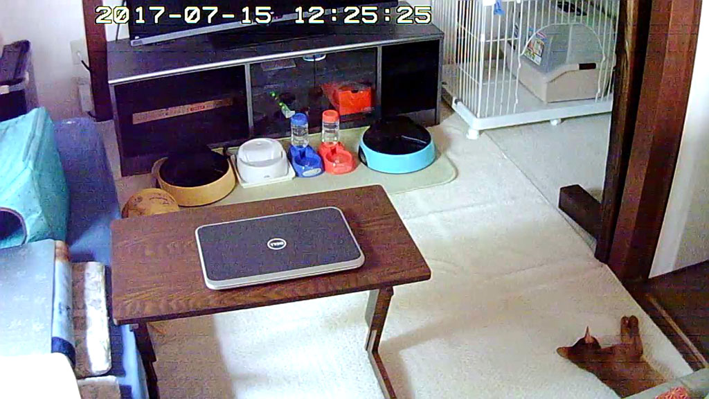 これは、3日前の(金)のお昼過ぎのアビのすけ君でしたが、Webカメラで2階の様子を見てみたら、踊り場の所で、仰向けになって、まるで、人間の様に寝ていた、本当にお茶目なアビのすけ君。(笑)