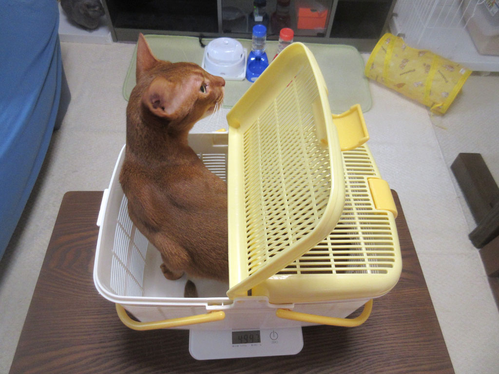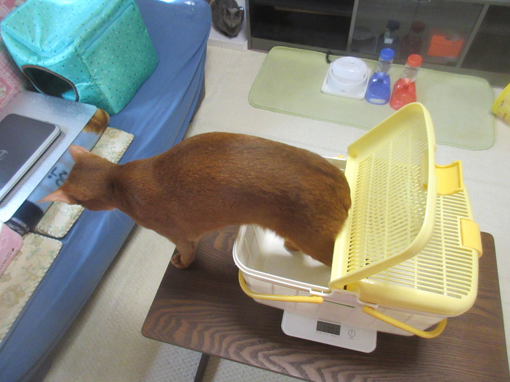 アビのすけの体重測定。そして、毎週(水)恒例の、我が家の猫たちの体重測定の様子…、まずは、アビのすけから…。
