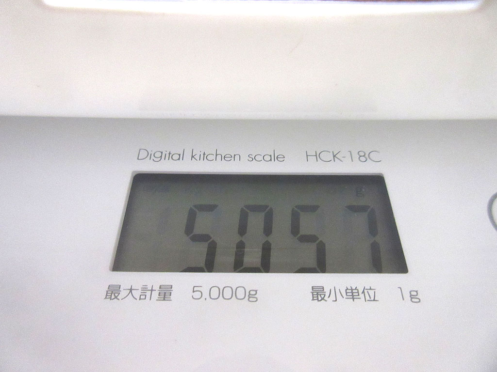 それにしても、この中国製のキッチンスケール…、一応、「最大軽量5,000g」って書いてあるけど、まだ測れてるんですけど…、さすがは中国製…、有難いと言えば、有難いんだけど、きちんと測れているのかまで、疑わしくなって来る…。