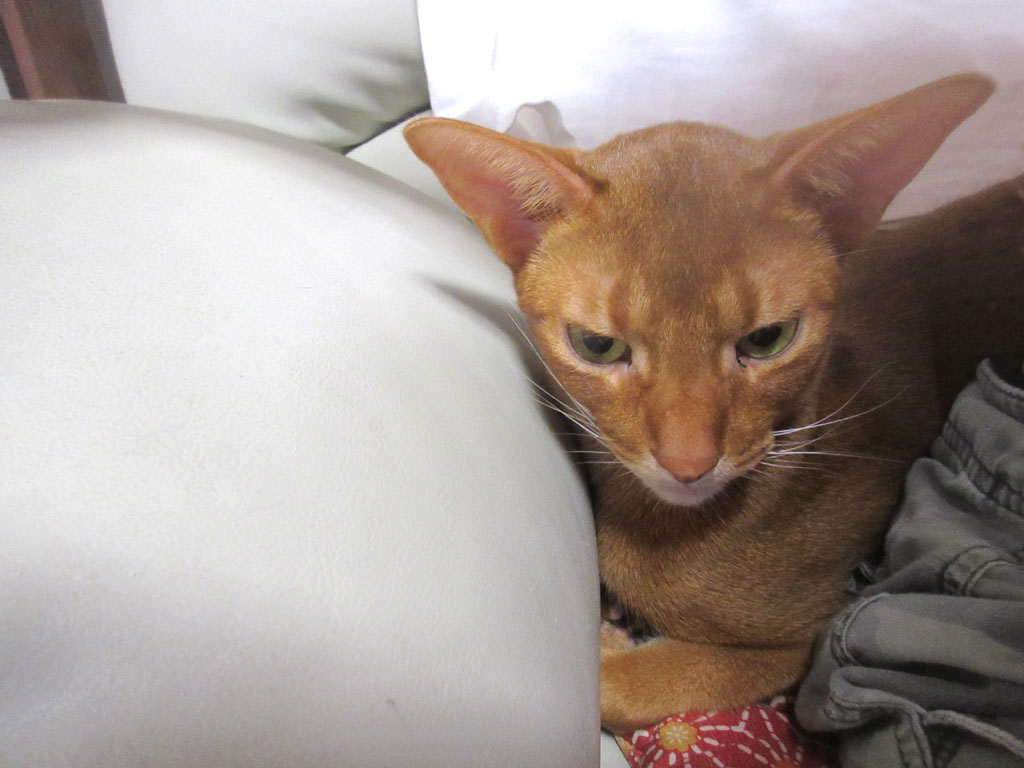 これは、旅行に行く2日前、7/30(日)の晩のアビのすけですが、私、この写真、大好き…! アビのすけ、私に引っ付きたくて、私とソファーのほんの少しの隙間に潜り込んで来て…、本当に、とっても甘えん坊なアビのすけ君。(笑)