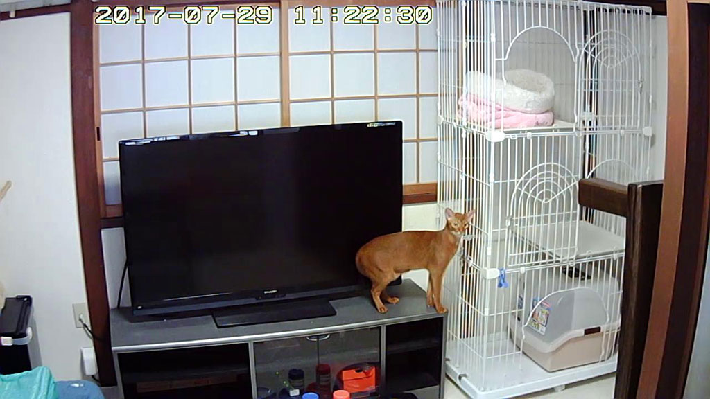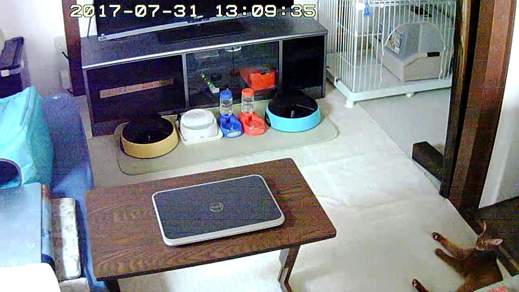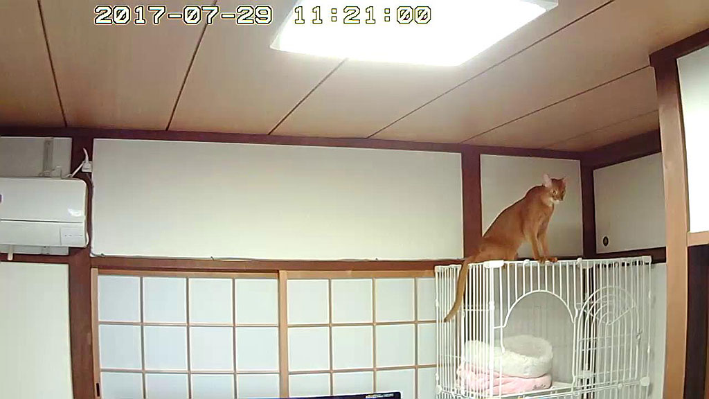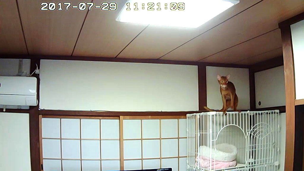 そして、順不同になってしまいましたが、これは、上の写真の前日の、7/29(土)のお昼前の事…、1階のパソコンのWebカメラから、カシャカシャする音が聞こえて来たので、何事かと思ってWebカメラを覗いたら、アビのすけがケージの上に上っていました。