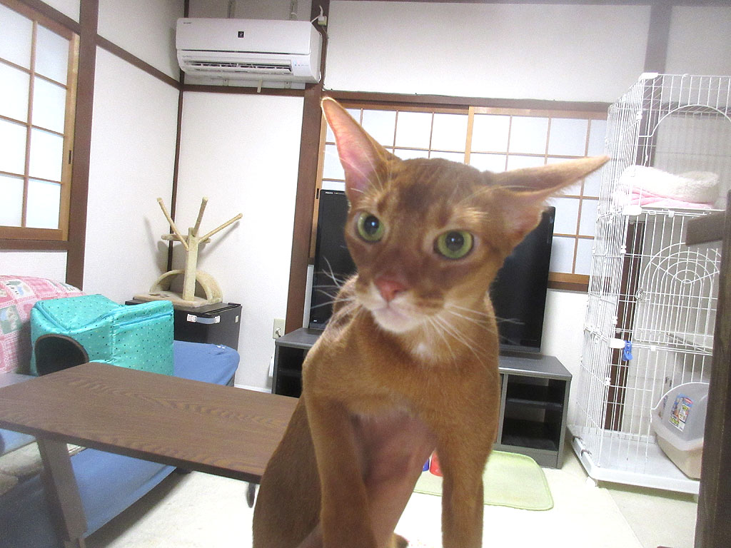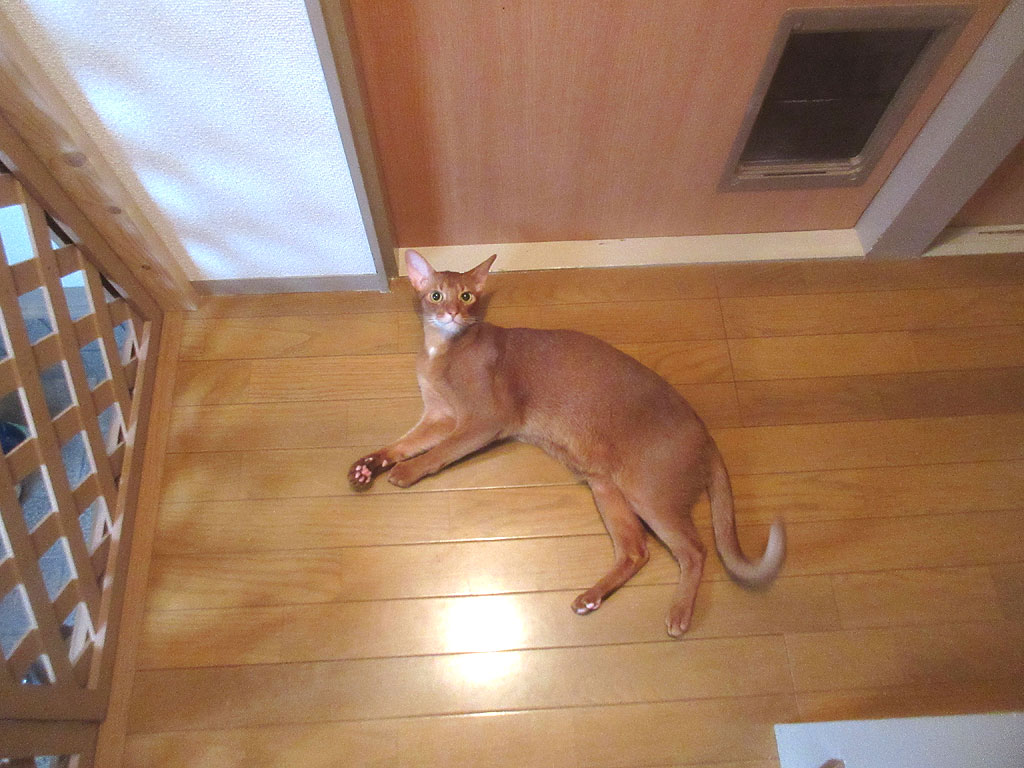 全く気にしないアビのすけ。そうだ、思い出した…、これは、猫たちの朝ご飯後の事で、私は猫たちのご飯中に、猫トイレの掃除をしていて、2階のトイレの掃除が終わったので、1階の猫トイレを掃除しに行こうと思って階段を下りていたら、アビのすけが私の横をすり抜けて、ダッシュで2階から1階に下りたんだった…。