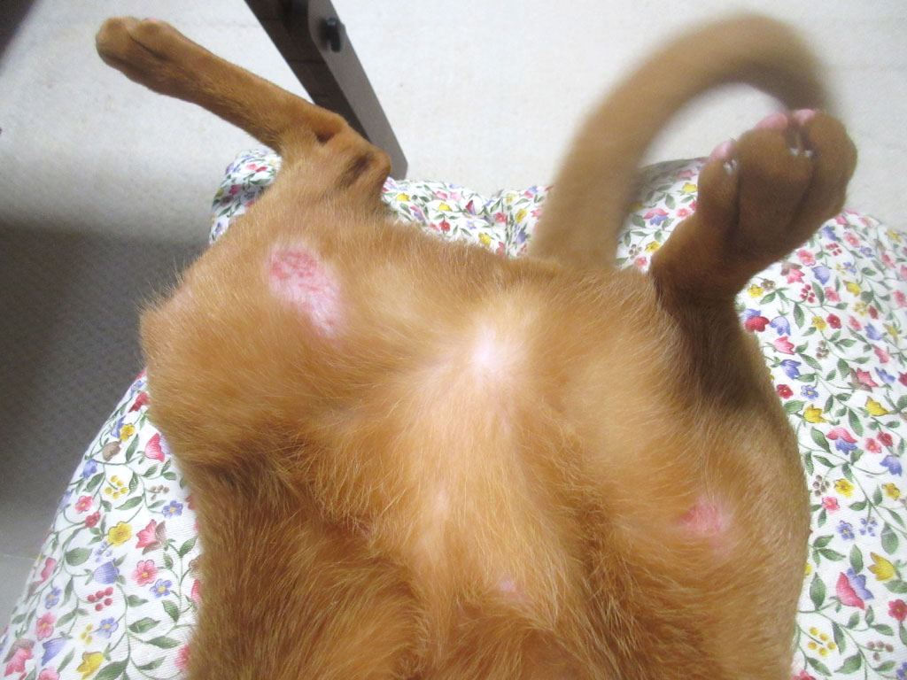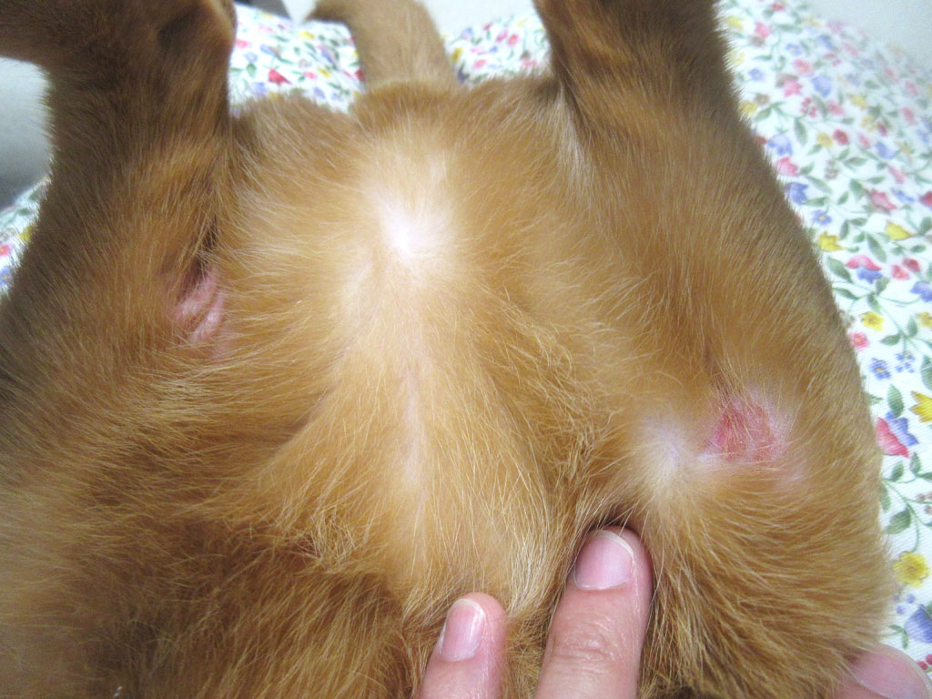 アビのすけの皮膚炎チェック。そして、アビのすけを仰向けにして、アビのすけの皮膚炎のチェックを開始…、どうだ、少しは良くなってるか…。