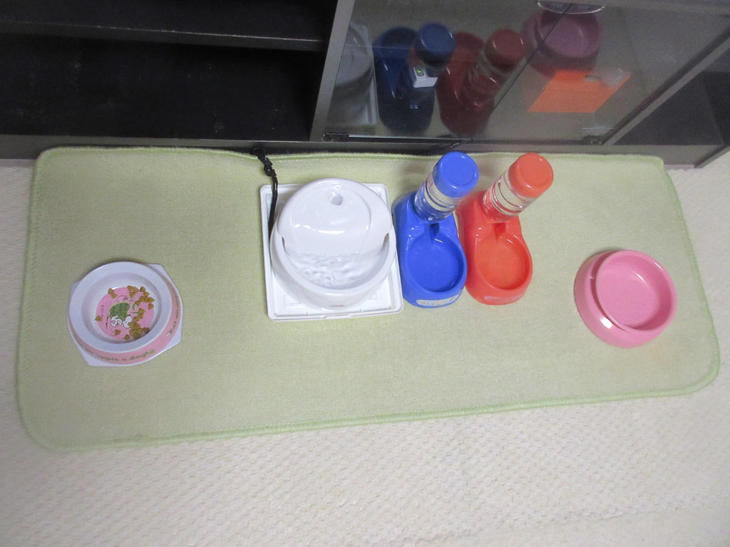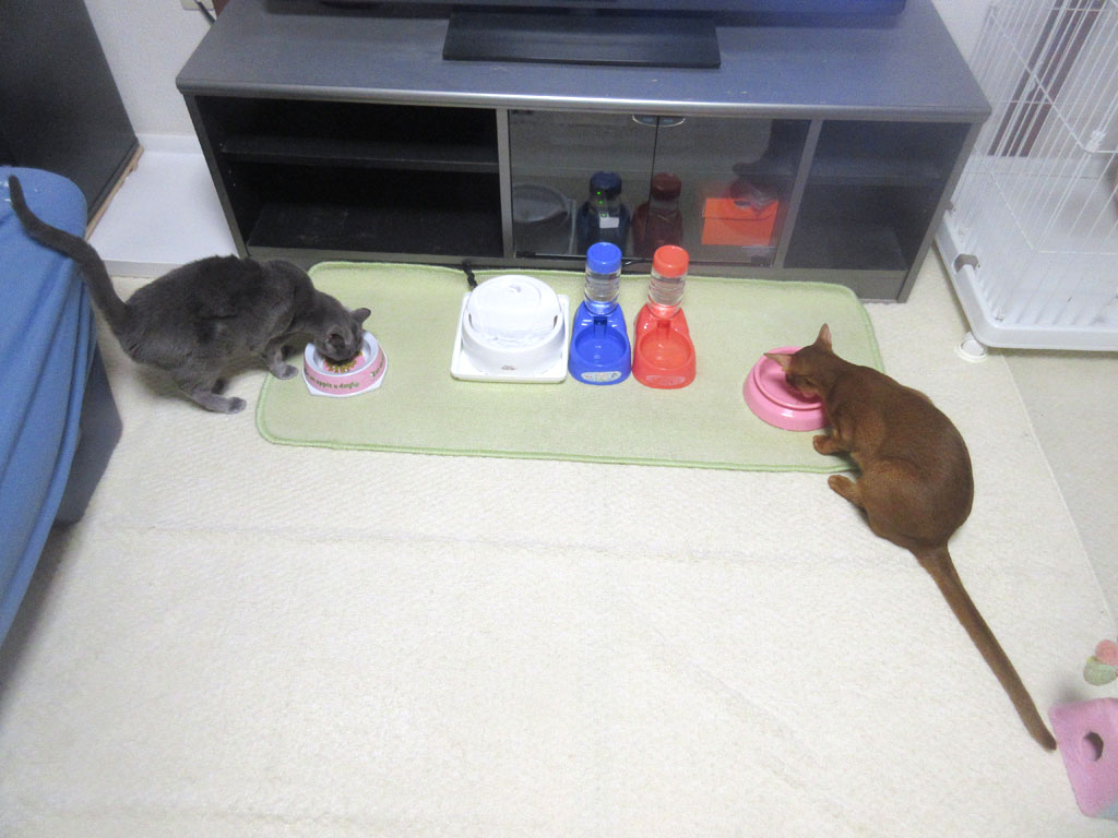 そしてこれは、食事療法の初日の晩ご飯の様子…、2階に療法食のご飯を持って上がると、辛うじて、猫たち、食べ始めてくれましたが…。