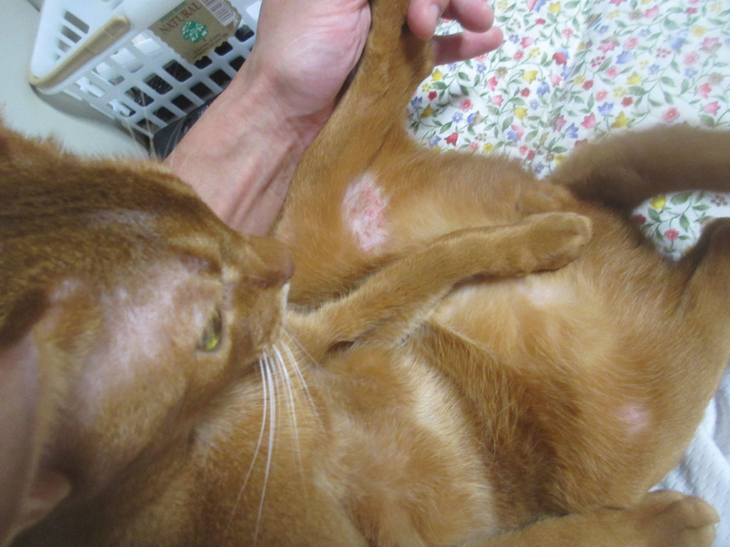 食事療法2日目の、8/23(水)朝一のアビのすけの皮膚炎の状況も、1枚だけ…、変わらず、左足の内側には、皮膚炎の残骸が残っています。