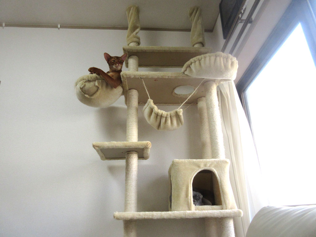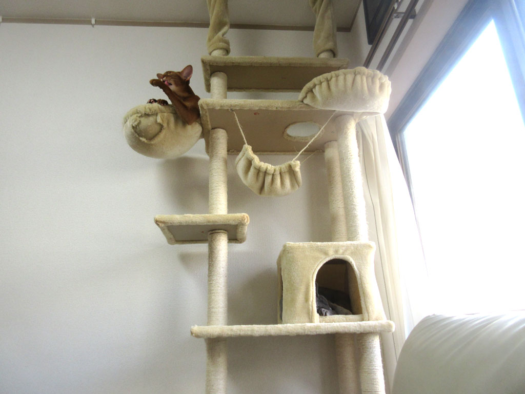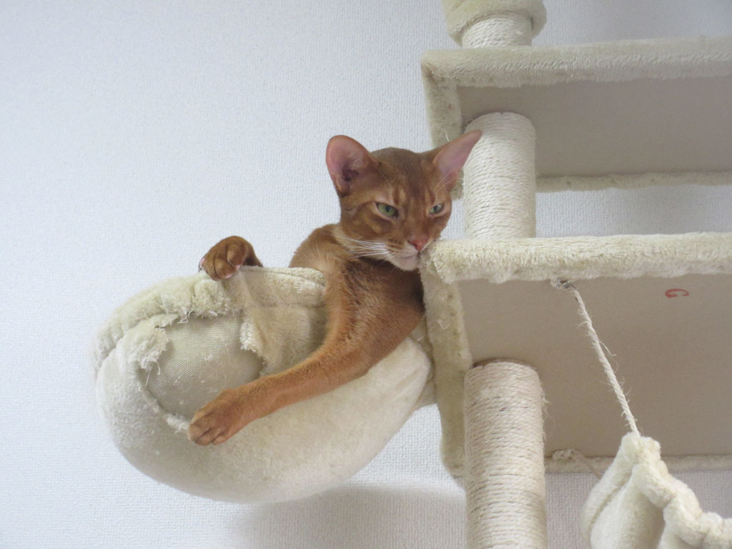 寛ぐアビのすけ。これは、その翌々日の8/27(日)…、お気に入りの、キャットタワーのにゃんもっくで、お手手をペロペロしていたアビのすけ君。