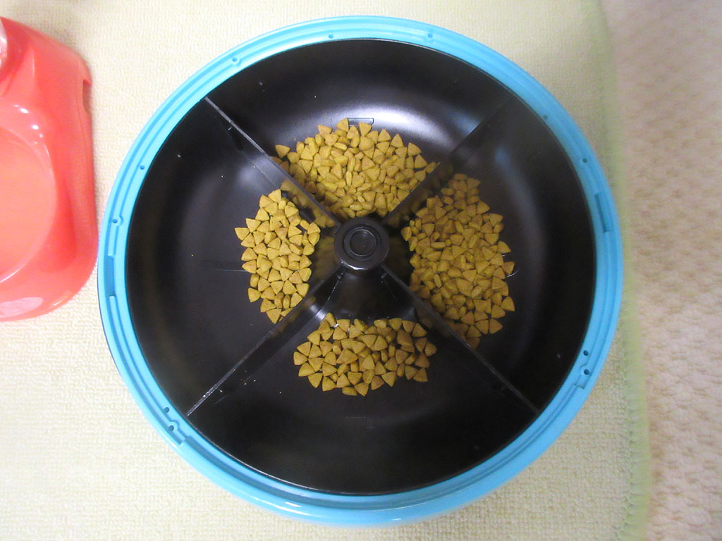 参考までに、これ、私が旅行に出発する前に準備した、アビのすけのビフォーの自動給餌器…、一見、低分子プロテイン、普通のカリカリなんだけど、匂いも悪くないんだけど、味覚が悪いんだろうなぁ~…。