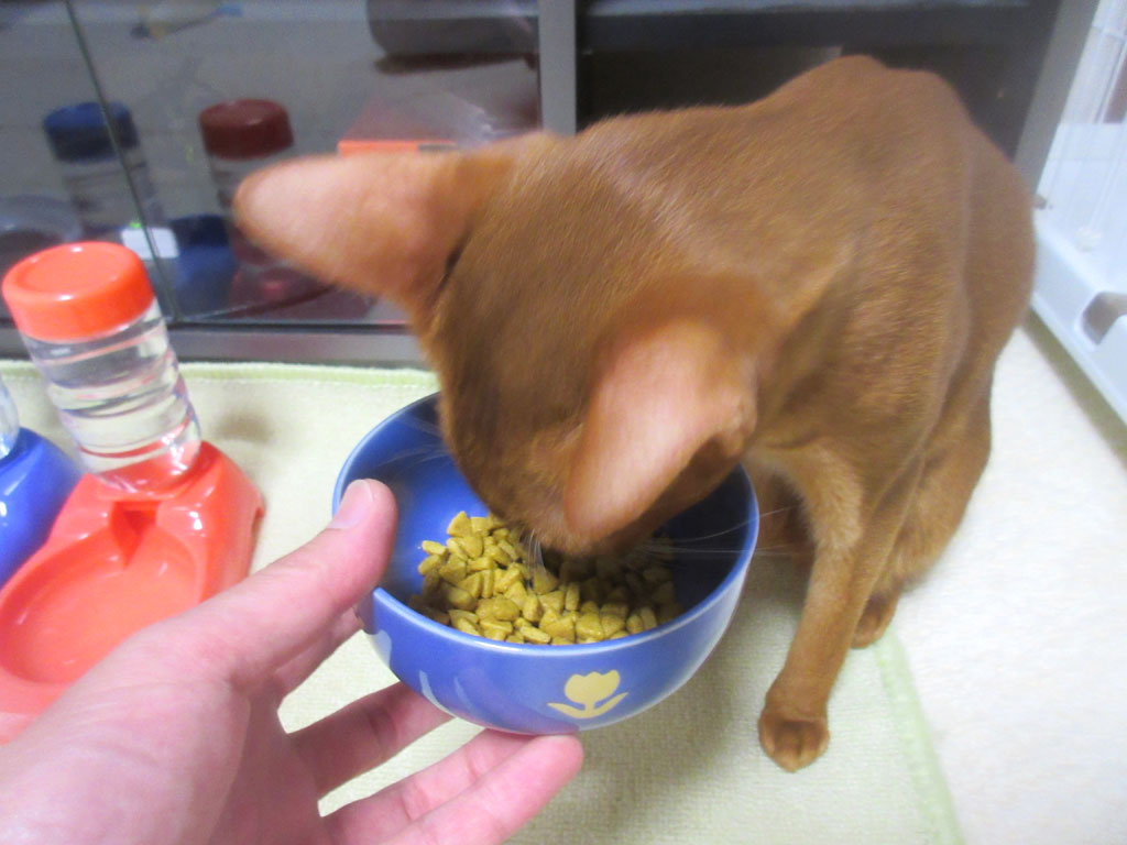 するとアビのすけ、狩猟本能が出て来るのか、餌を逃してはならぬと、お皿を追い掛けて、がぶがぶとお皿に、顔を突っ込んで食べてくれるのです。
