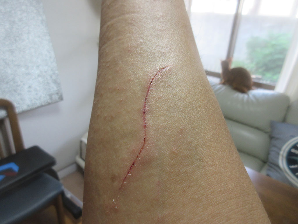 結果、動画にもちょっと写っていましたが、こんな傷は当たり前…、引っ掻かれた時には、すぐに水で消毒?しに行くのですが、その時の水の滲みる事、滲みる事…。