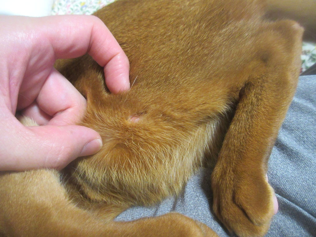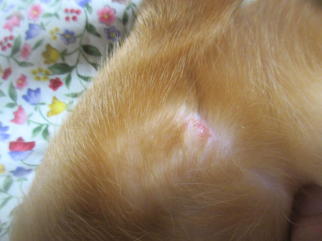 これ、昨日の晩の0時前の事でしたが、旅行から帰って来て、猫たちのブラッシングをしていなかったので、夜な夜な、猫たちのブラッシングを始めたのですが、新たな皮膚炎が出来ているのを、私、見つけてしまって…。(涙)