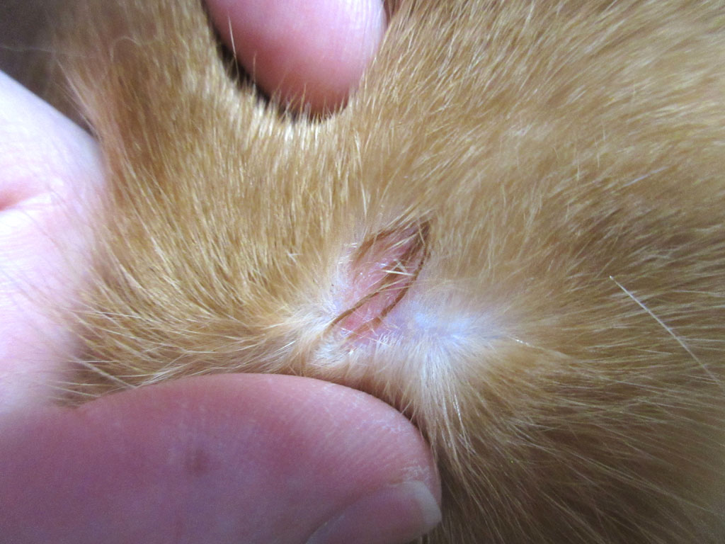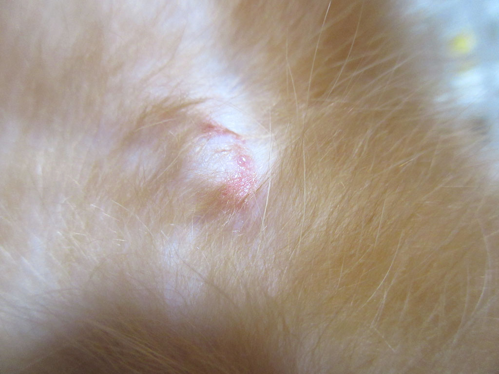 毛が束になって湿っている感じだったので、今、まさに、舐め舐めしてたって感じの、アビのすけの新たな皮膚炎…、なので、まだ、出来てほやほやの皮膚炎だと思う…。