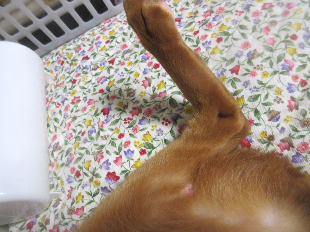 これ、アビのすけの左足の膝の外側に出来た、新たなアビのすけの皮膚炎…。