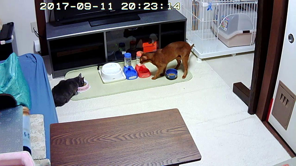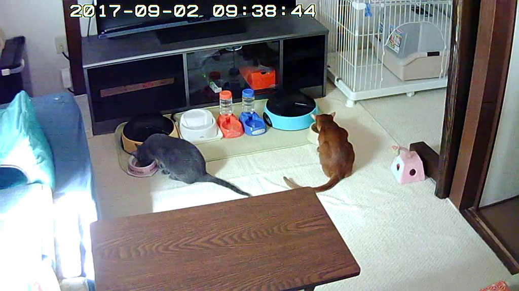 これは、その翌日、9/2(土)の猫たちの朝ご飯の様子…、この時は、まだ、昼ご飯を自動給餌器にセットしていたのですが、今は、アビのすけには、私がお皿を持って食べさせる事も多いので、昼ご飯は自動給餌器ではなく、手動です。
